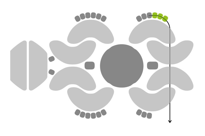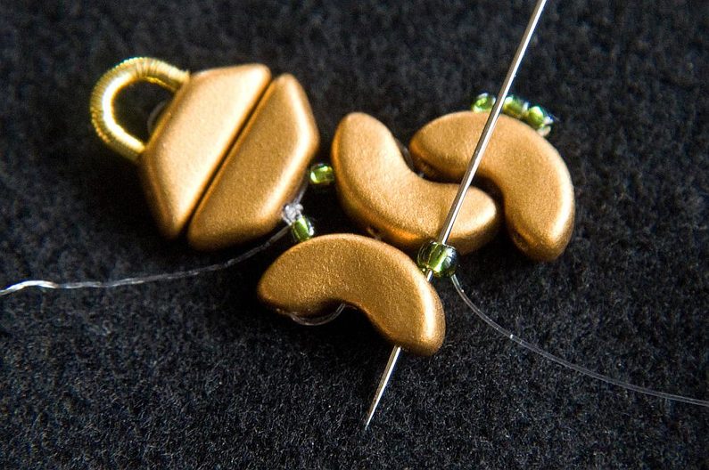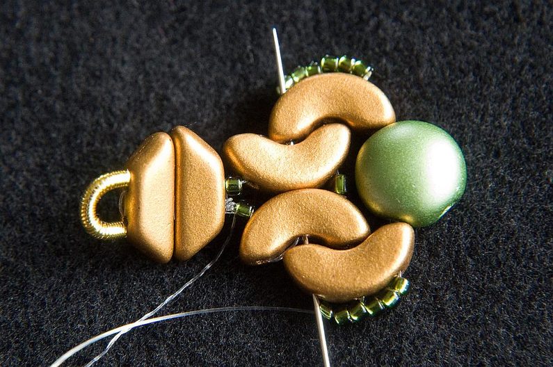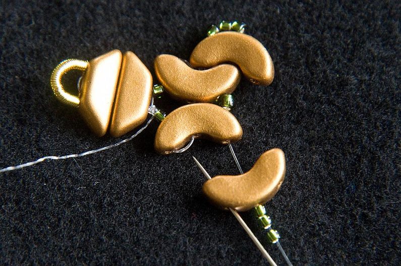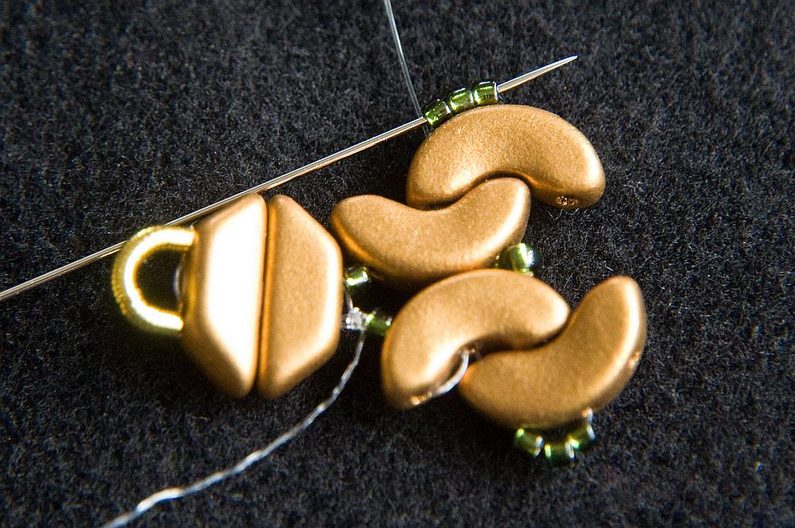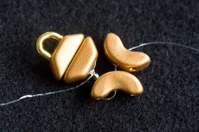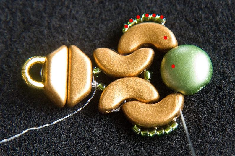 Navlékneme 3× TR15 a provlékneme všechny čtyři AP (Obr. 28). Navlékneme 3× TR15 a provlékneme následující tři TR15 (Obr. 29). Provlékneme následující AP, PC8 a AP (Obr. 30). Provlékneme i následujících šest TR15 a tři následující AP (Obr. 31). Provlékneme krajní dírku AP zevnitř (Obr. 32).