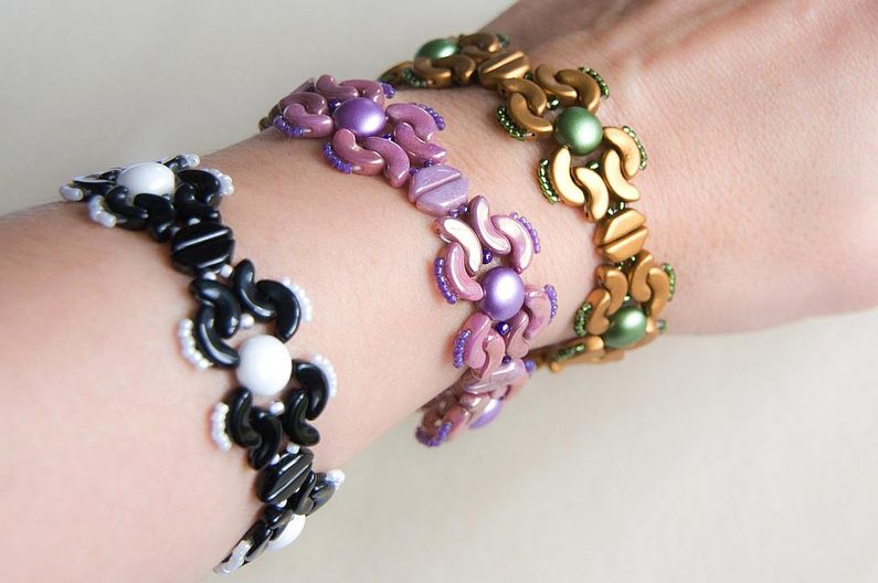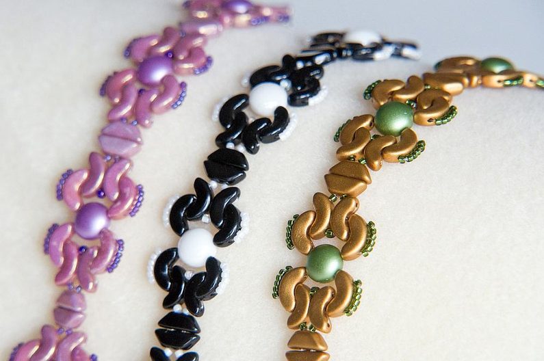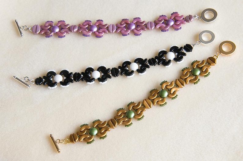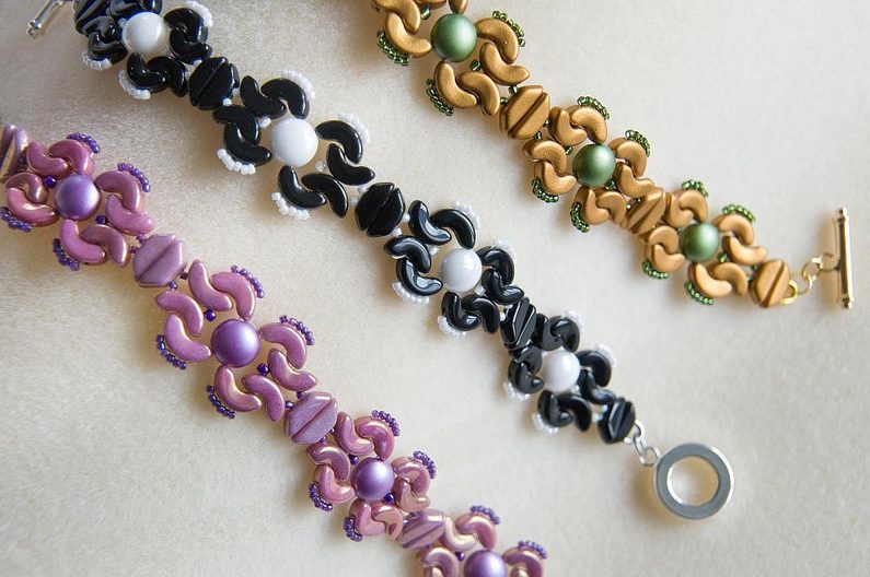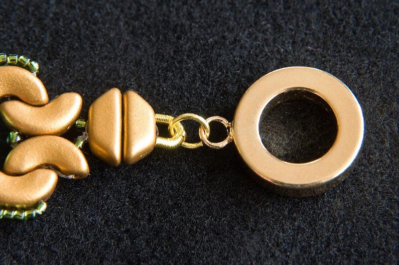 Totéž zopakujeme i na druhém konci. Pokud potřebujete nastavit délku náramku, stačí přidávat mezi podkůvku a druhou část zapínání spojovací kroužky nebo bižuterní řetízek podle potřeby (Obr. 42). Náramek je hotový, můžete si ho barevně přizpůsobit jakékoli denní i večerní akci (Obr. 43–46).