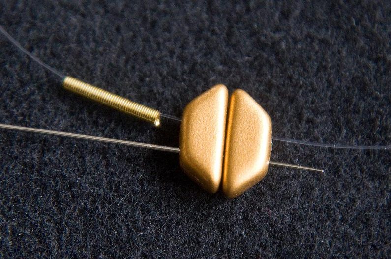 Opakujeme Krok 2–8. Celkem ušijeme 4 „moduly“, každý s PC8 uprostřed. Končíme dvěma TP (Obr. 37). Navlékneme 1 cm French wire a provlékneme druhou dírku TP (Obr. 38). Utáhneme, aby z French wire vznikla podkůvka chránící vlasec. Nyní můžeme vlasec zapošít – provlékáme zpět náramkem skrz korálky, až jsme si jistí, že je vlasec utažený a zapošitý, a zbytek vlasce můžeme odstřihnout. Zapošijeme i druhý konec vlasce (Obr. 39). Do podkůvky z French wire zavěsíme spojovací kroužek a jednu část zapínání (Obr. 40). Pomocí plochých ketlovacích kleští kroužek uzavřeme (Obr. 41).