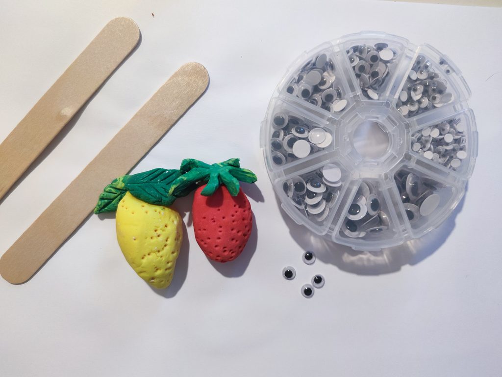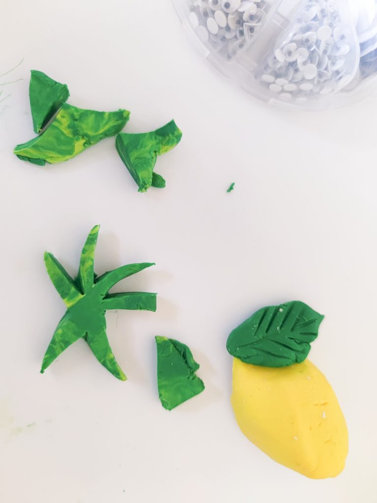 Dětské ruce necháme vymodelovat tvar připomínající ovoce a jeho lístečky. Pomocí modelovacích nástrojů můžou děti tvaru dát detaily struktury.