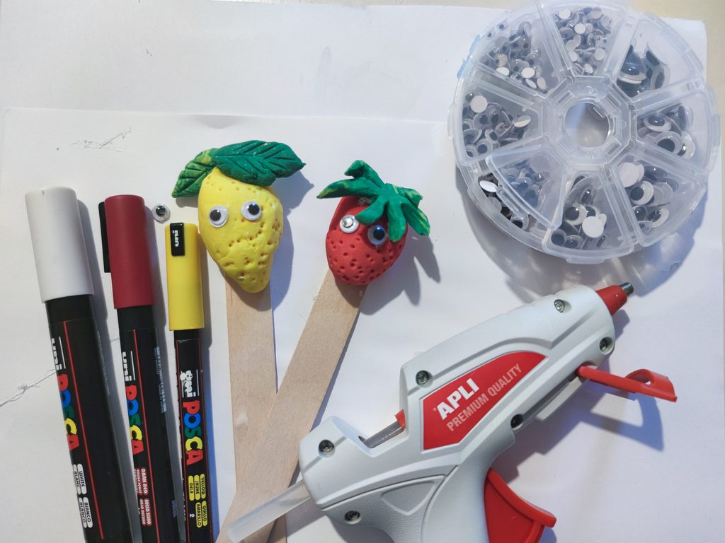 Poté ji dospělý přilepí tavnou pistolí na špachtli a děti dolepí očička.