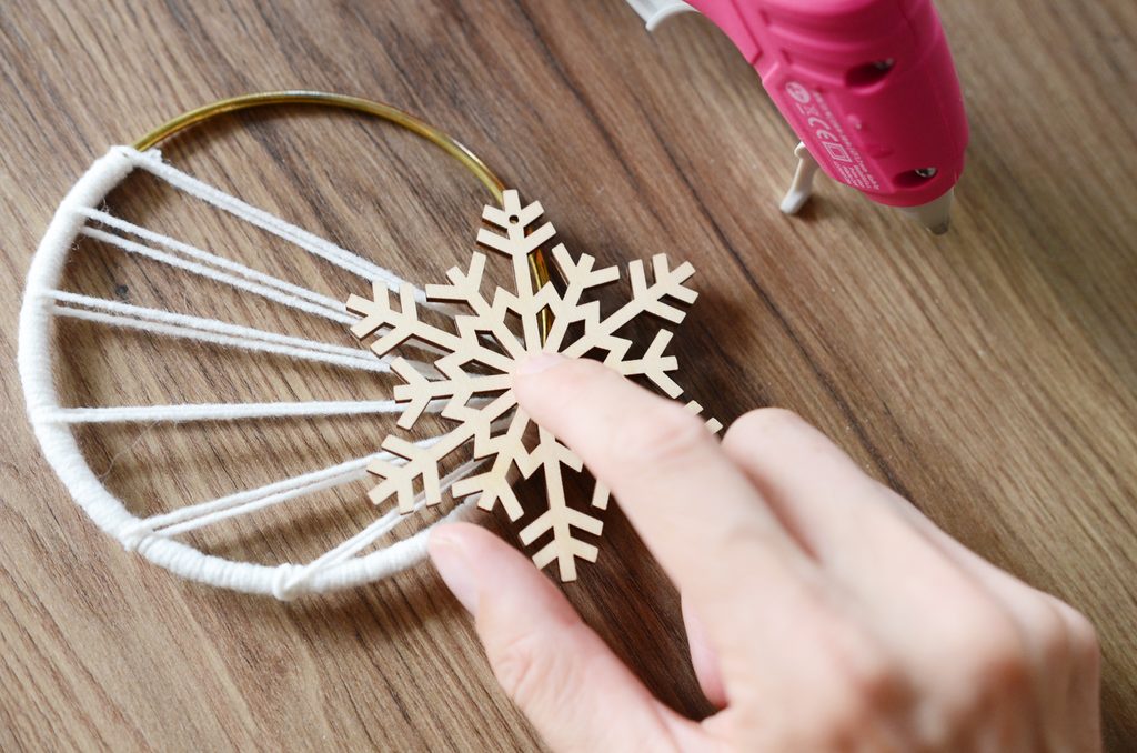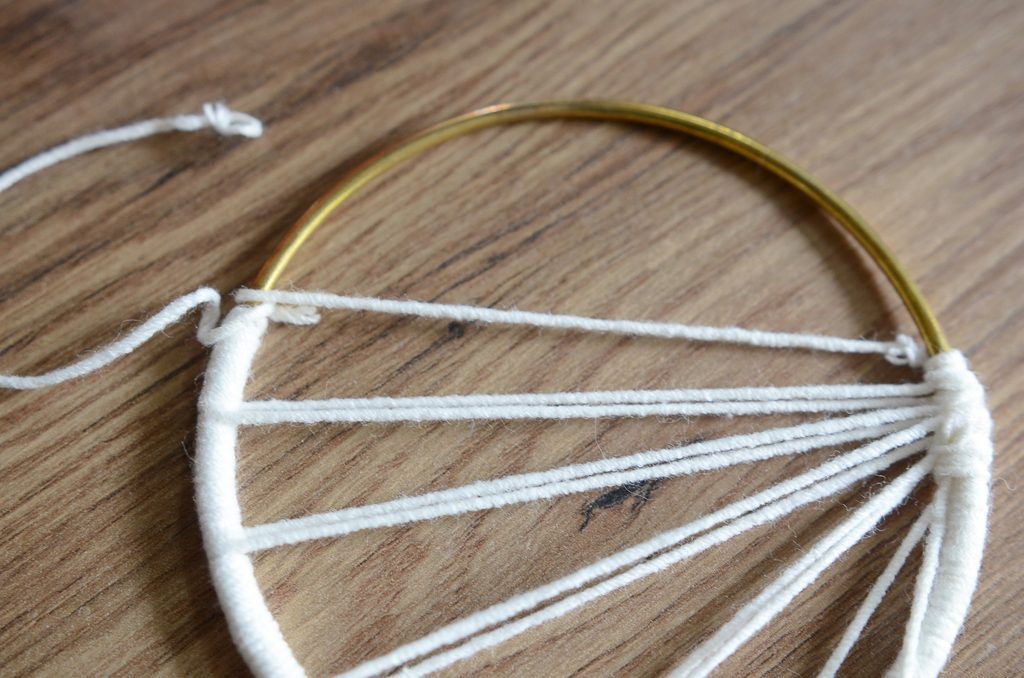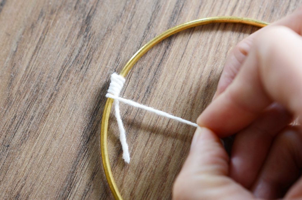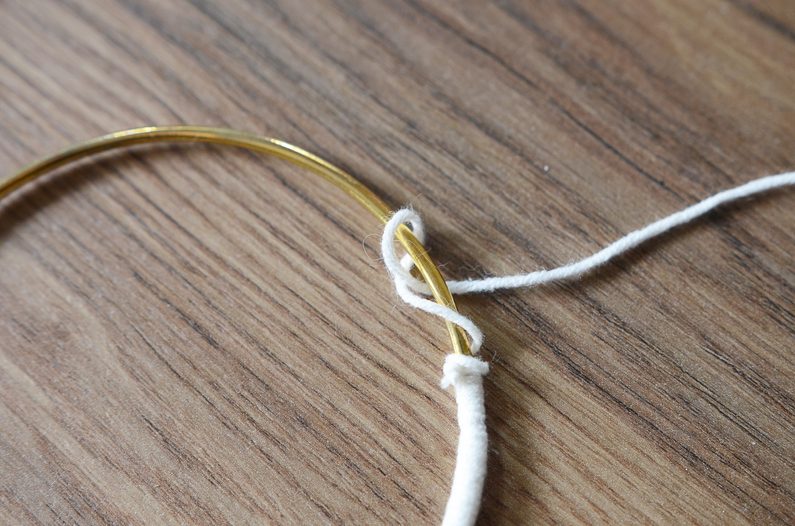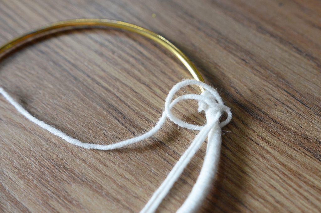 Na kruh udělejte z příze uzel, konec ohněte a ve stejném směru obtáčejte i zbytek příze až do zhruba poloviny kruhu. Volný konec tak zůstane zcela skrytý.