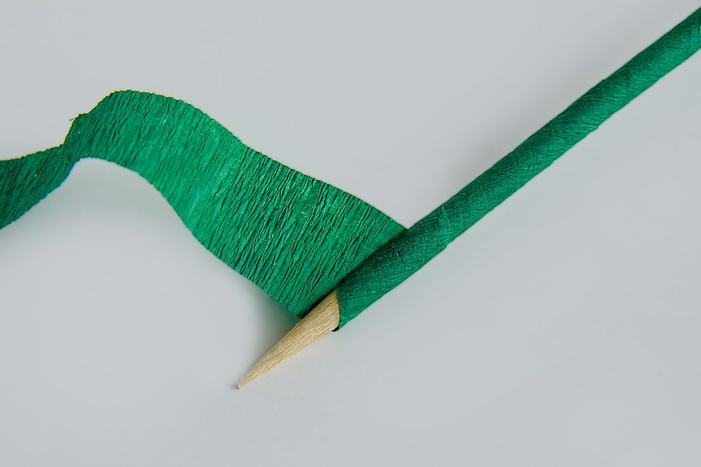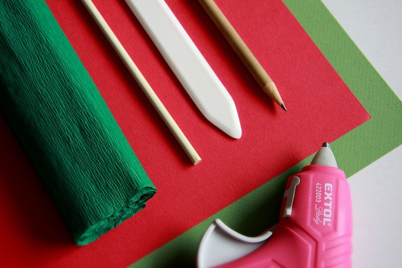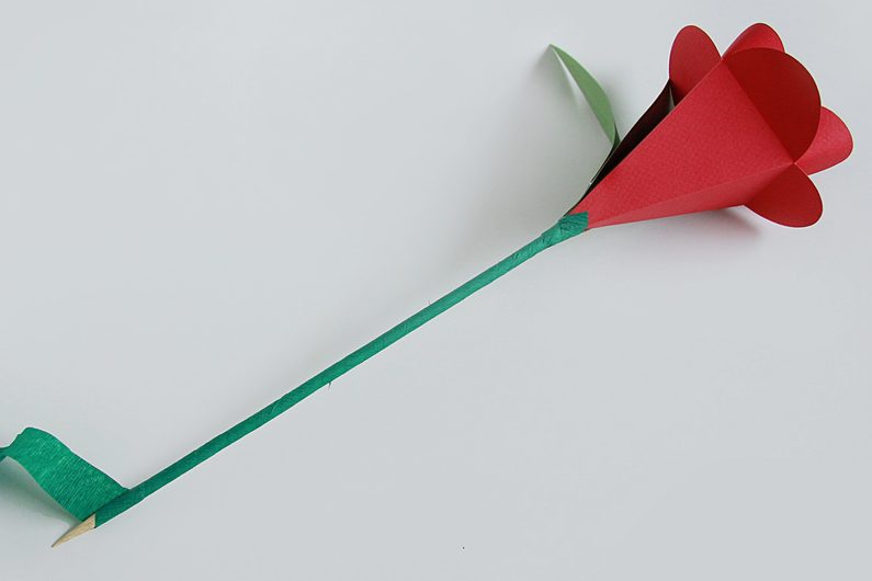 Ustřihneme krepový papír cca 1,5 cm široký, 50 cm dlouhý a omotáme jím celou bambusovou špejli. (Špičku u bambusové špejle můžeme uříznout a nebo naopak nechat a květ zapíchnout například do květináče).