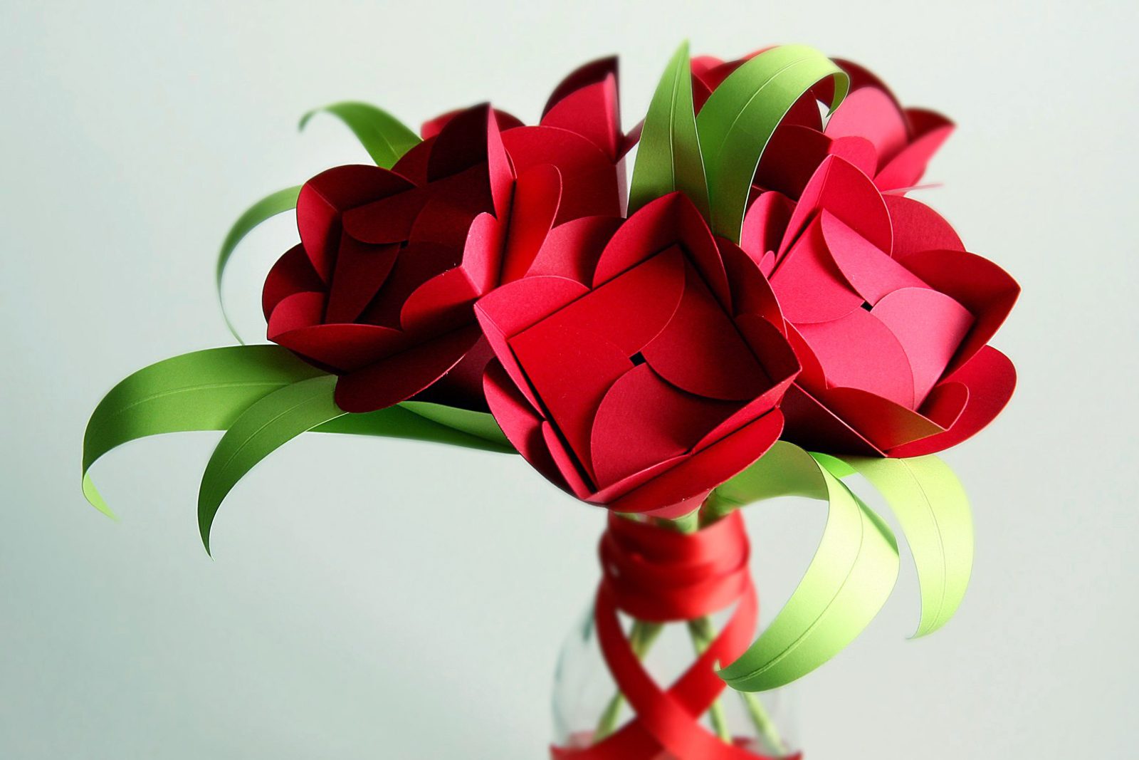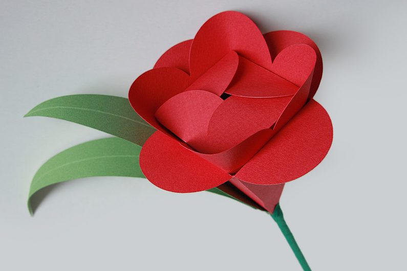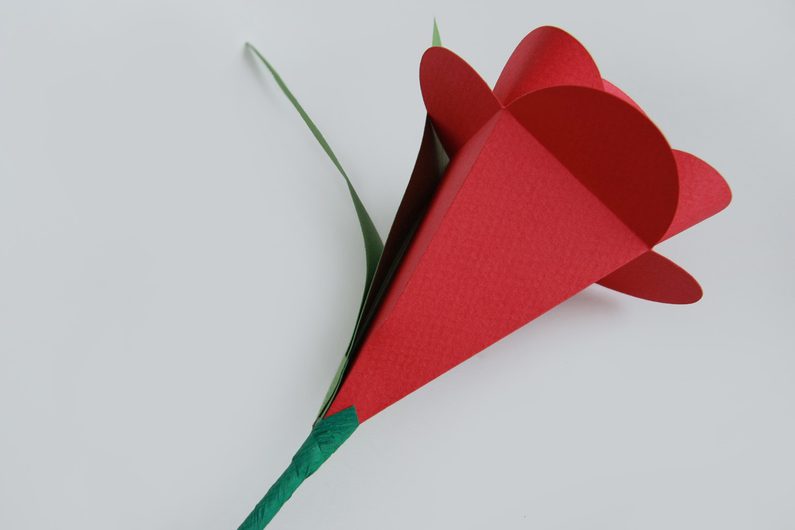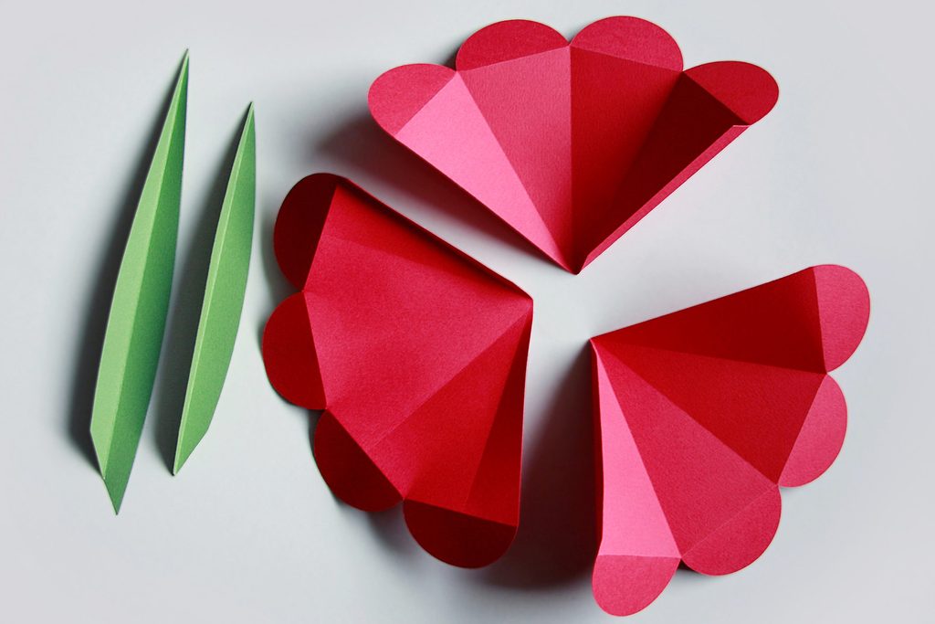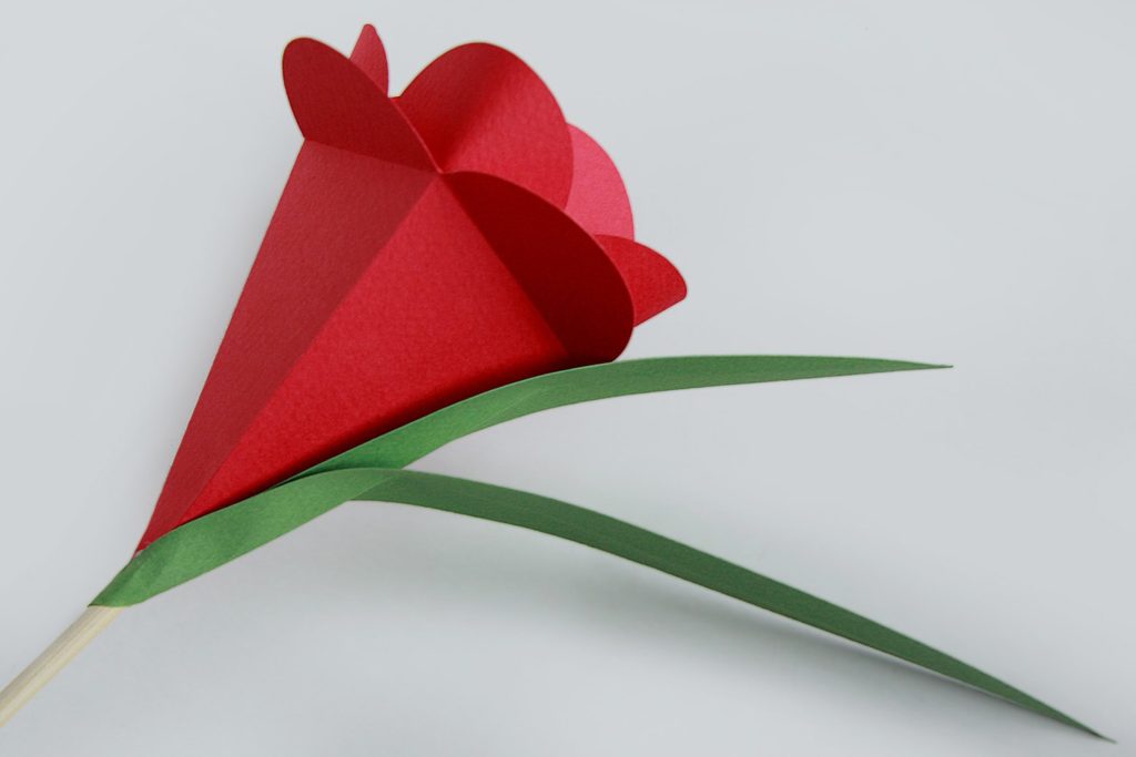 Pokud máme možnost, vytiskneme si předlohu na tiskárně. Předlohu po vytisknutí vystřihneme a následně obkreslíme na barevný papír. Z barevného papíru vystřihneme červený květ 3x a zelené listy 2x.