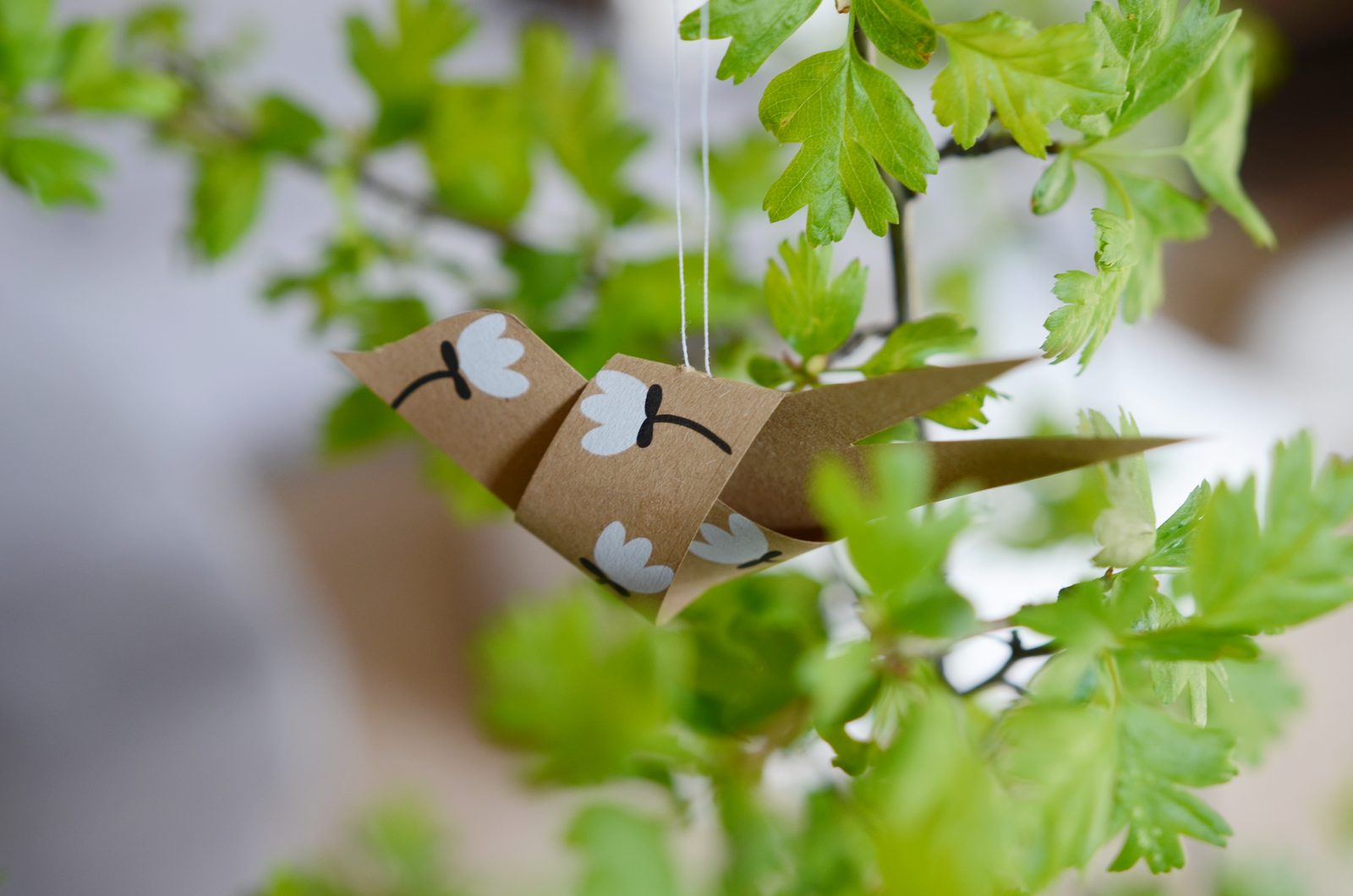 Ocásek smyčkou protáhněte a jemně dotáhněte, aby se nerozmotal. Shora papír stačí už jen proděravět a z niti vytvořit poutko. Hotovo! Už zbývá jen dát větvičky do vázy a ptáčky na ně zavěsit.