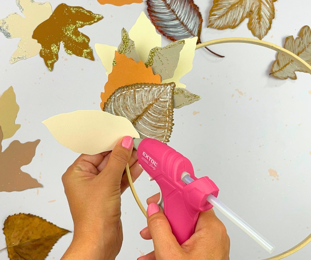 Na konec postupně pomocí tavné pistole nalepte všechny varianty listí na dřevěný kruh. Střídejte všechny druhy listů a lepte je těsně k sebe, aby jste vytvořili plný kruh bez mezer. Nesnažte se o pravidelnost.