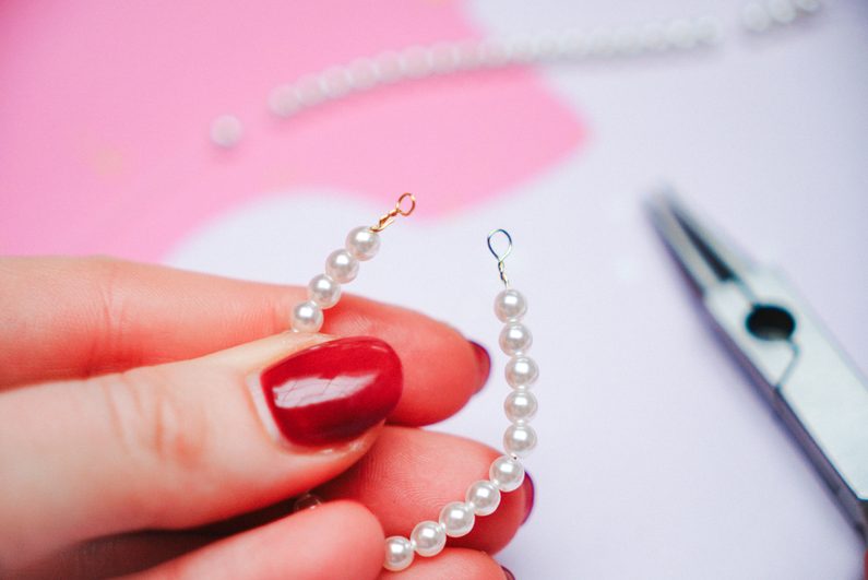 •  Pomocí spojovacího kroužku spojíme očka k sobě a připevníme náušnicové háčky.