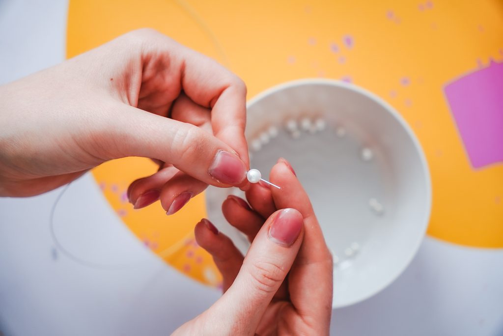 Navlékáme perličky a kombinujeme se zlatými korálky ve tvaru srdíčka.
