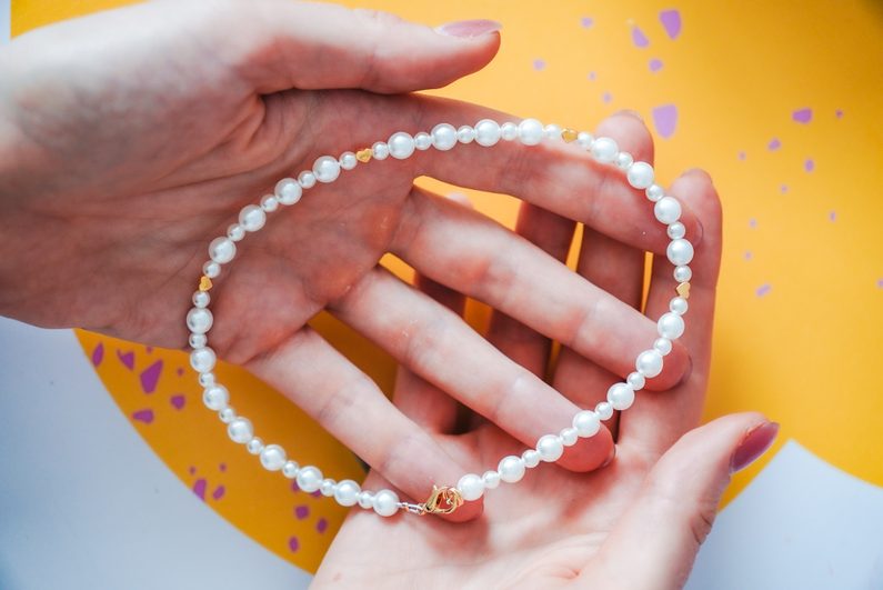 Na konci opět pomocí zamačkávacího rokajlu uděláme očko a připevníme bižuterní karabinku na zapínání. Na druhé straně přidáme spojovací kroužek, abychom měli karabinku do čeho zachytit.