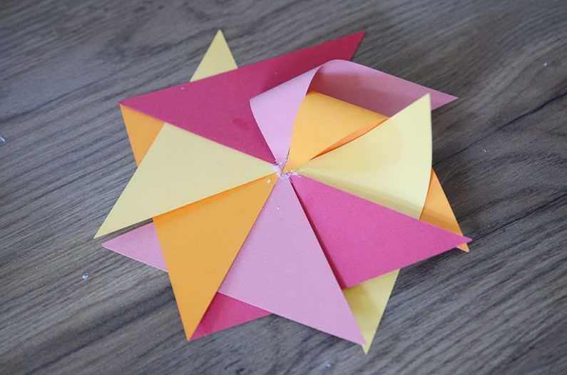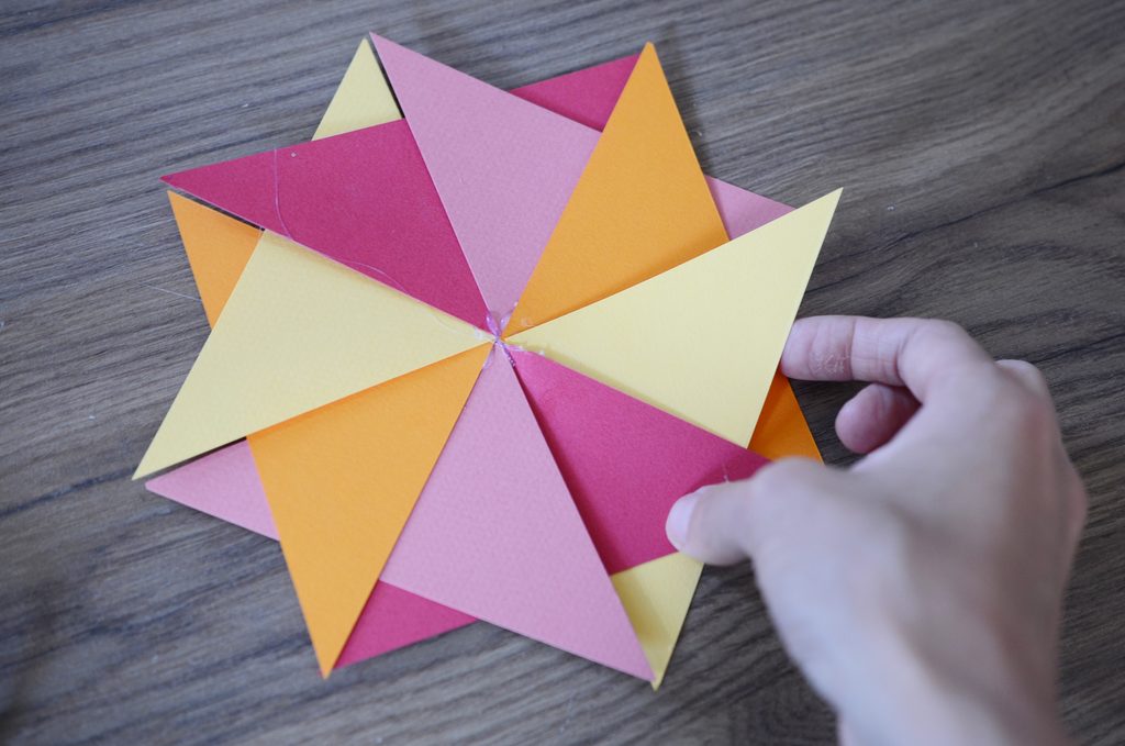 Nalepujte postupně vždy jednu špičku od každého trojúhelníku ke středu.