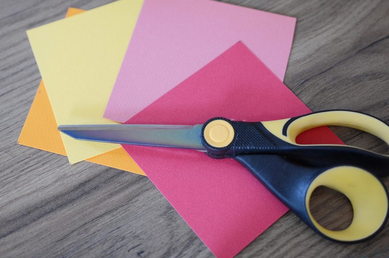 Z kartonů si vystřihněte čtyři čtverce. Každý následně rozdělte šikmo tak, aby vám vzniklo celkem osm stejných trojúhelníků. Vystřihněte si také z jednoho kartonu malé kolečko.