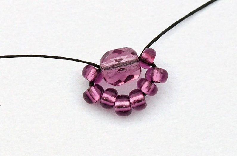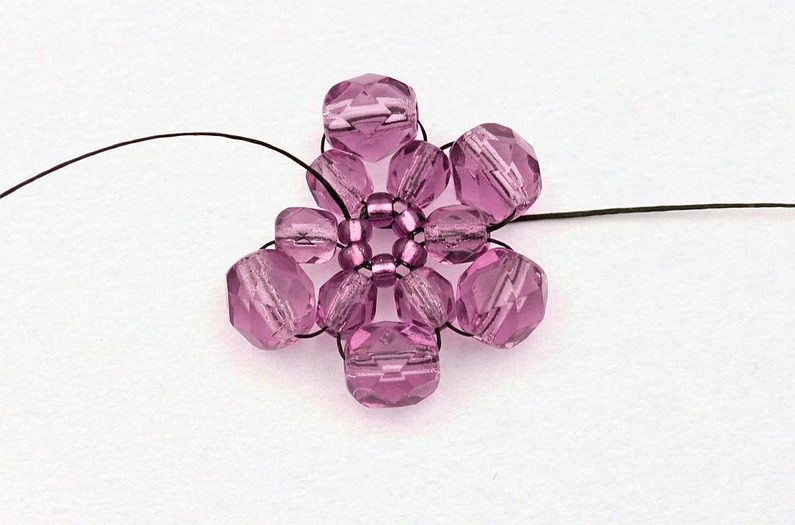 Vznikne kytička, kterou bude po obvodu tvořit pět 6mm broušených korálků a jednou namísto broušeného korálku čtyři rokajly Preciosa. Kytičku dokončíme provlečením nitě šestým rokajlem a svázáním konců nití. Než zbytky nití ustřihneme, prošijeme jimi několik korálků za sebou. Tak konce schováme a nebudou nikde trčet.