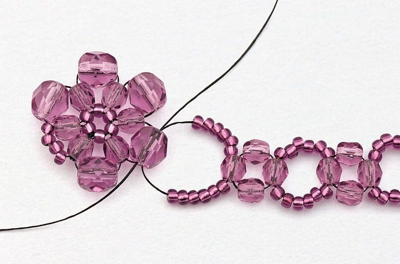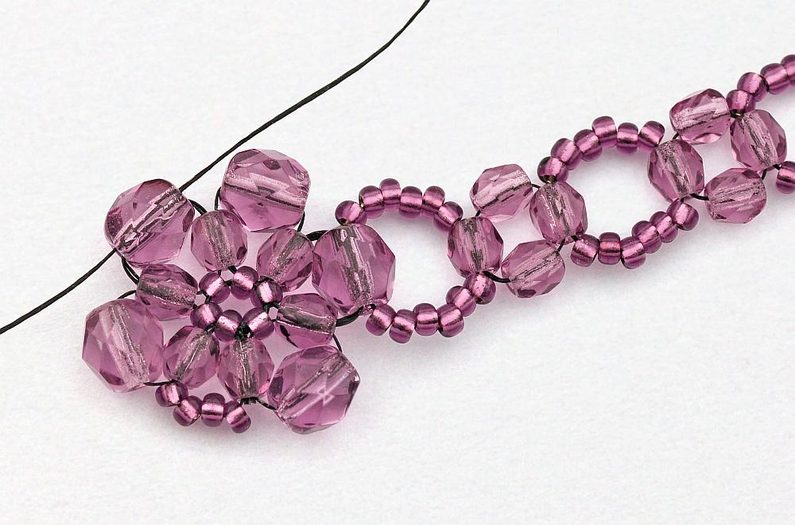 Krok 9) a 10) zopakujeme ještě čtyřikrát s tím, že poslední očko nebudeme zakončovat novým 4mm broušeným korálkem, ale použijeme jednu z připravených kytiček. Nitě prošijeme protisměrně jedním ze 6mm broušených korálků.