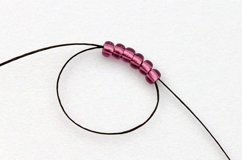 Začneme navlečením šesti rokajlů Preciosa velikost 10 na nit. Konec nitě necháme dostatečně dlouhý pro pozdější zavázání a zapošití. Navlečené korálky prošijeme ještě jednou a nit utáhneme (obr. 1). Vznikne tak kolečko, které můžeme zajistit svázáním konců nití (obr. 2).