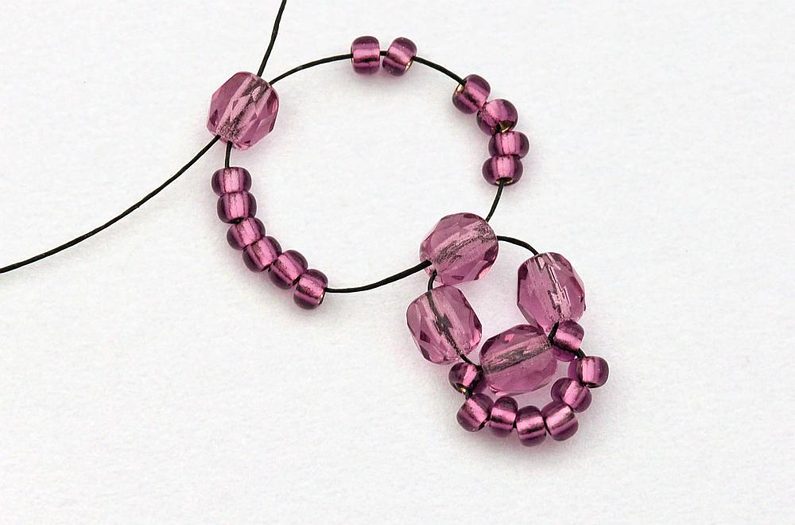 Na každý konec nitě navlečeme šest rokajlů Preciosa a pomocí 4mm broušeného korálku dokončíme další očko.