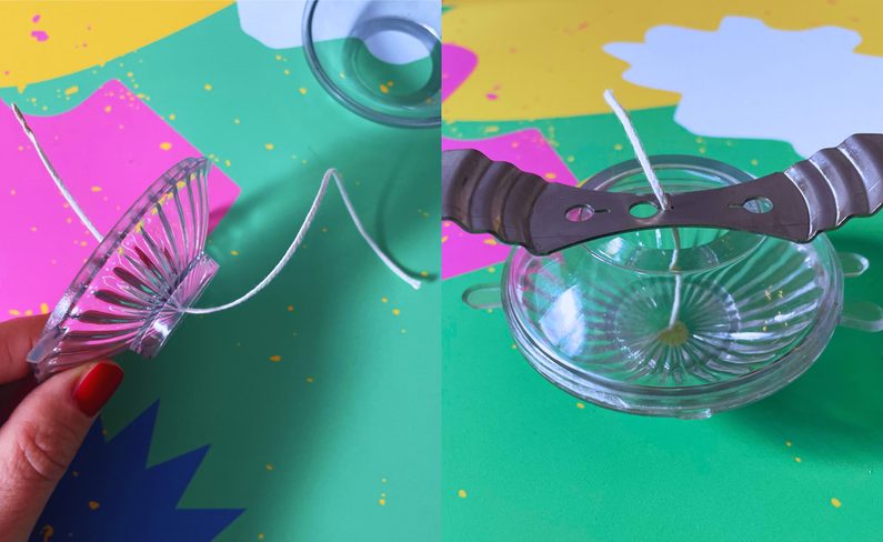 Mezitím, než se rozehřeje vosk ve vodní lázni, připravíme si formu na svíčku. Provlečeme knot, který ve spodní části zalepíme, například lepenkou, aby nevytekl vosk. Knot vycentrujeme držáčkem, aby po celou dobu schnutí byl uprostřed.