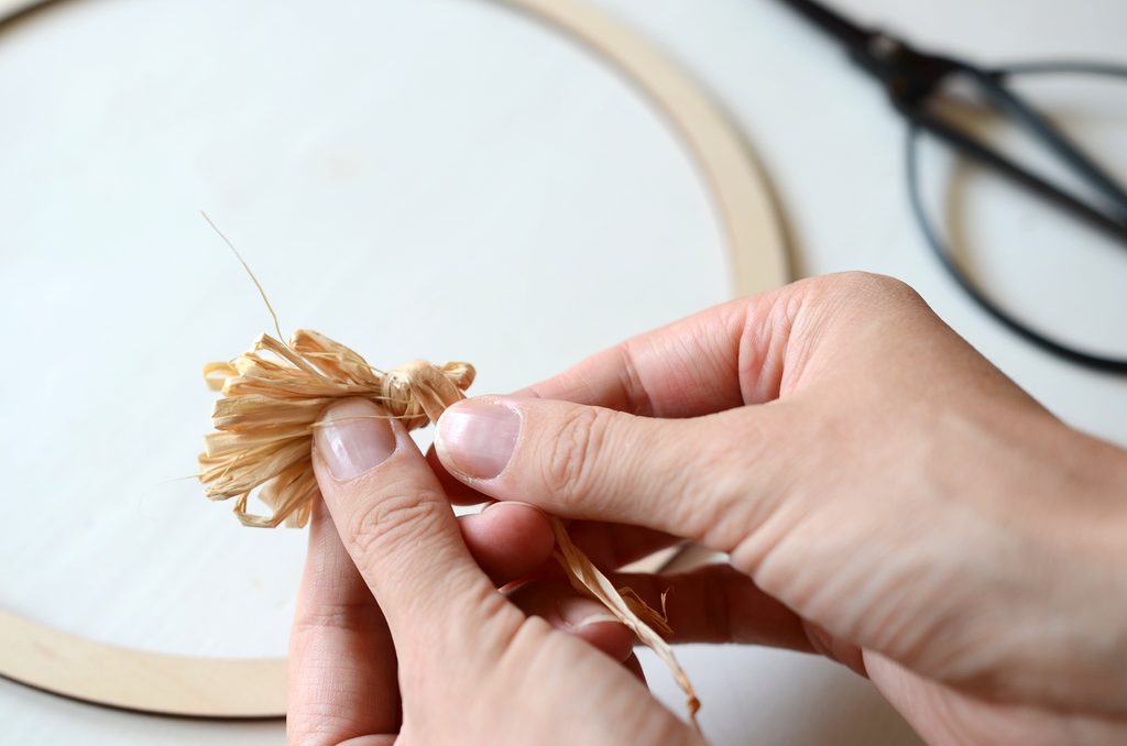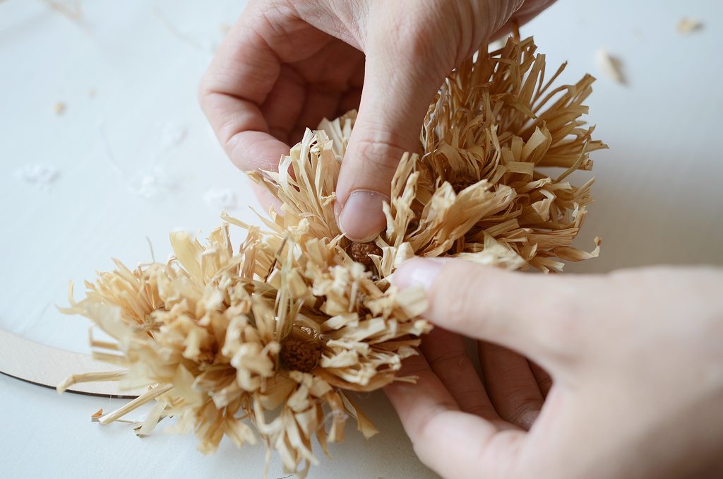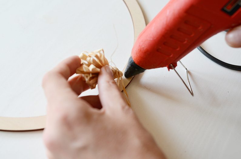 Vezměte si silnější pruh lýka a podle požadované „střapatosti“ věnce jej několikrát přeložte. Pár centimetrů na konci nechte volných. Tavnou pistolí naneste trochu lepidla na spodní kraj střapce a volným koncem jej několikrát obtočte a nechte zaschnout.