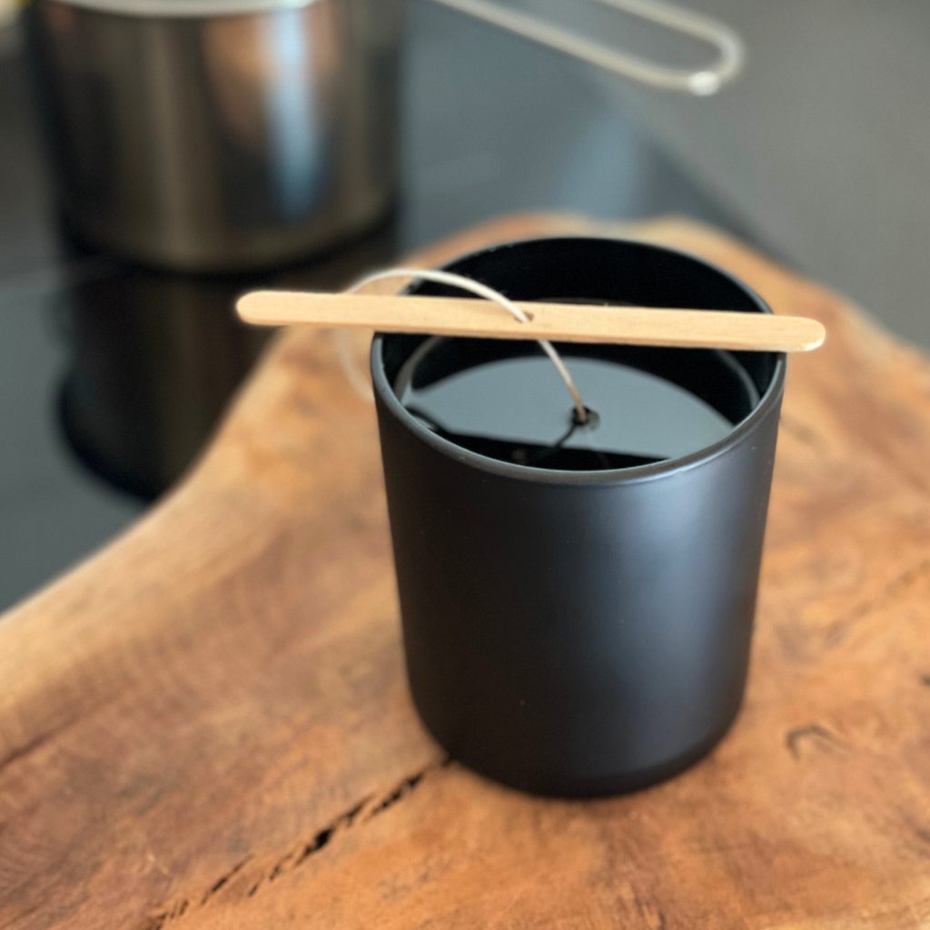 Teplý vosk vlijte do nádoby a cca z 95 % ji zaplňte. Nechte vosk trošku ztuhnout a dolijte zbytek vosku. Tím docílíte hladkého povrchu a nebude se vám vosk nikde propadat. Vosk nechte dokonale ztuhnout.
