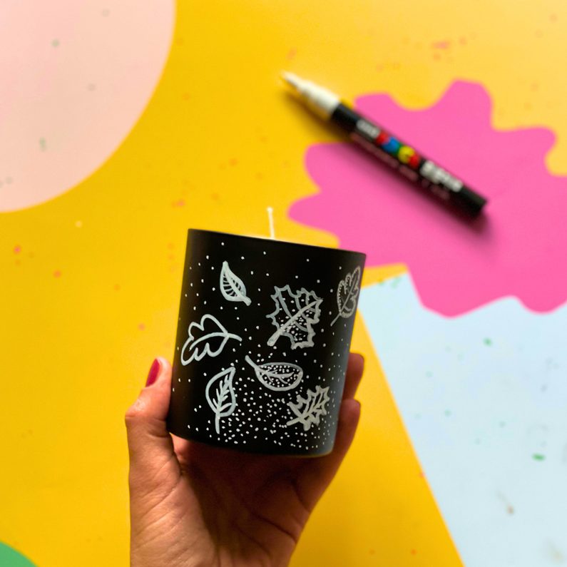 Až svíčku ztuhne, ozdobte si podle vaší představivosti nádobu svíčky. Můžete ji samozřejmě nechat i nepokreslenou.