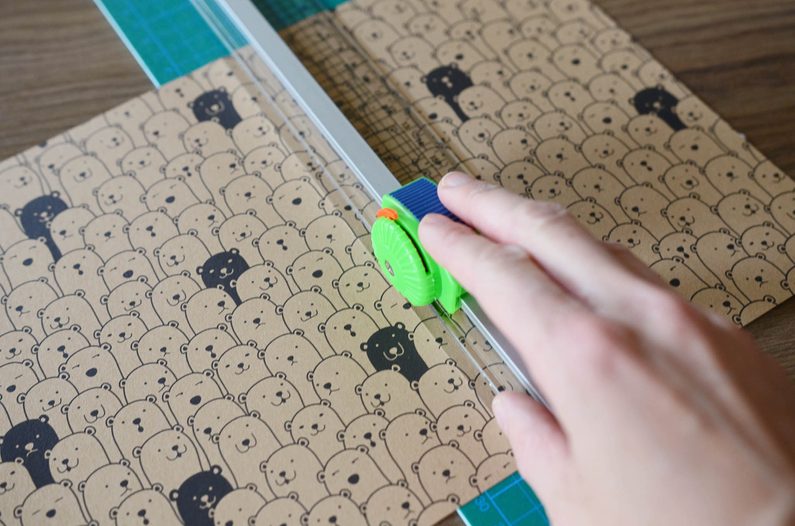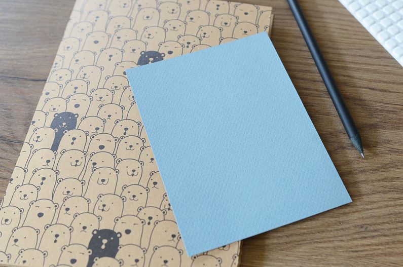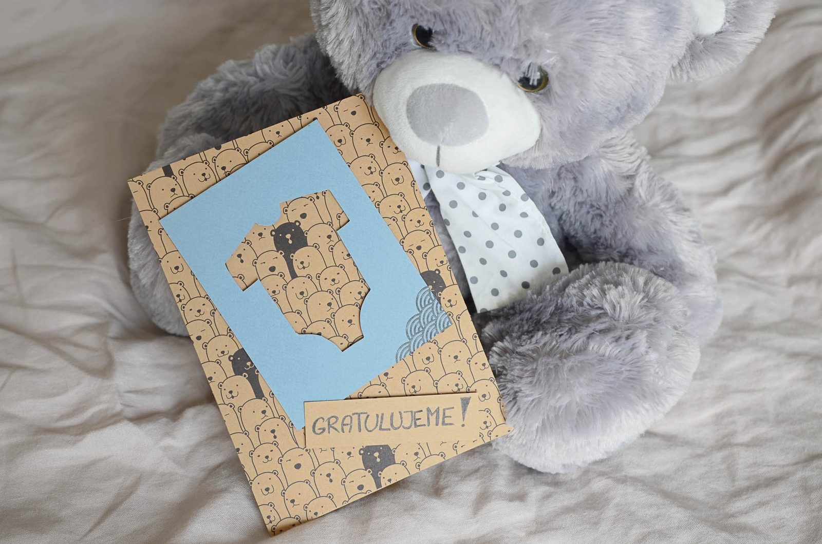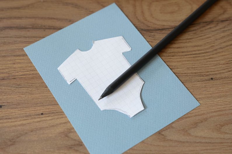 Z modré čtvrtky (případně růžové, pokud jde o holčičku) si vyřízněte obdélník, které bude menší než potištěná část s medvídky. Rozměr zvolte libovolný. Nakreslete obrys dětského body (můžete si nejprve nakreslit šablonu na běžný papír).