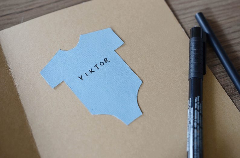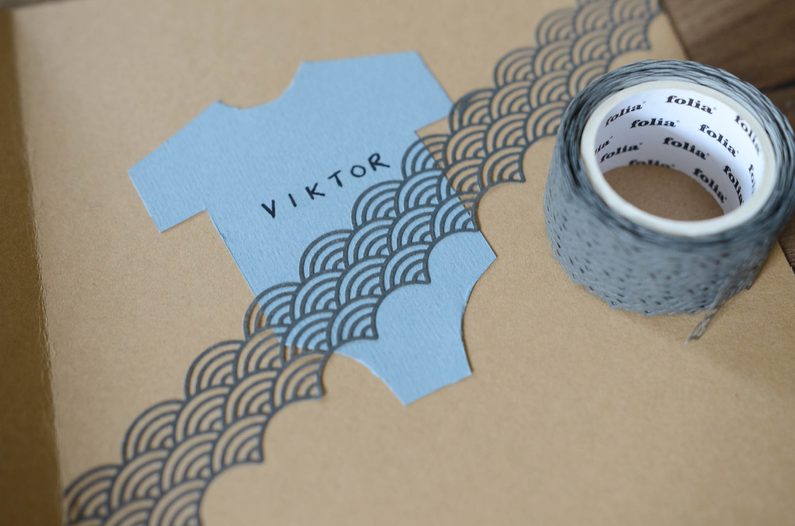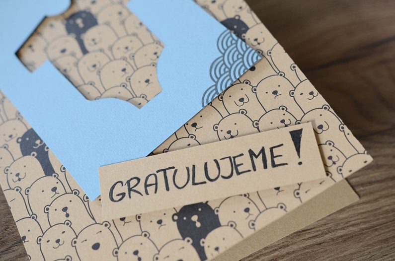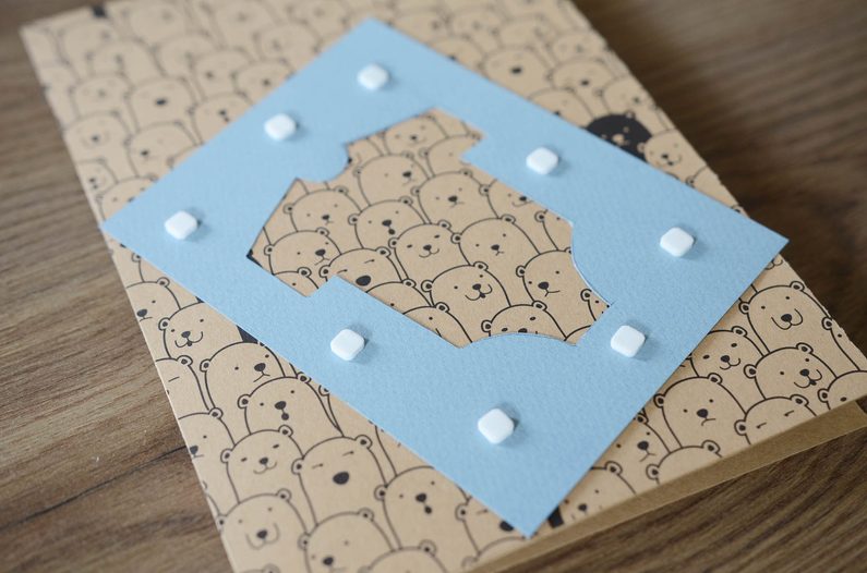 Do čtvrtky vyřízněte obrys body a ze spodní strany nalepte několik pěnových čtverečků, které následně přilepte na čelní stranu přání. Vyříznutý obrys můžete rovnou zužitkovat tak, že jej nalepíte dovnitř přání a napíšete jméno novorozeného miminka.