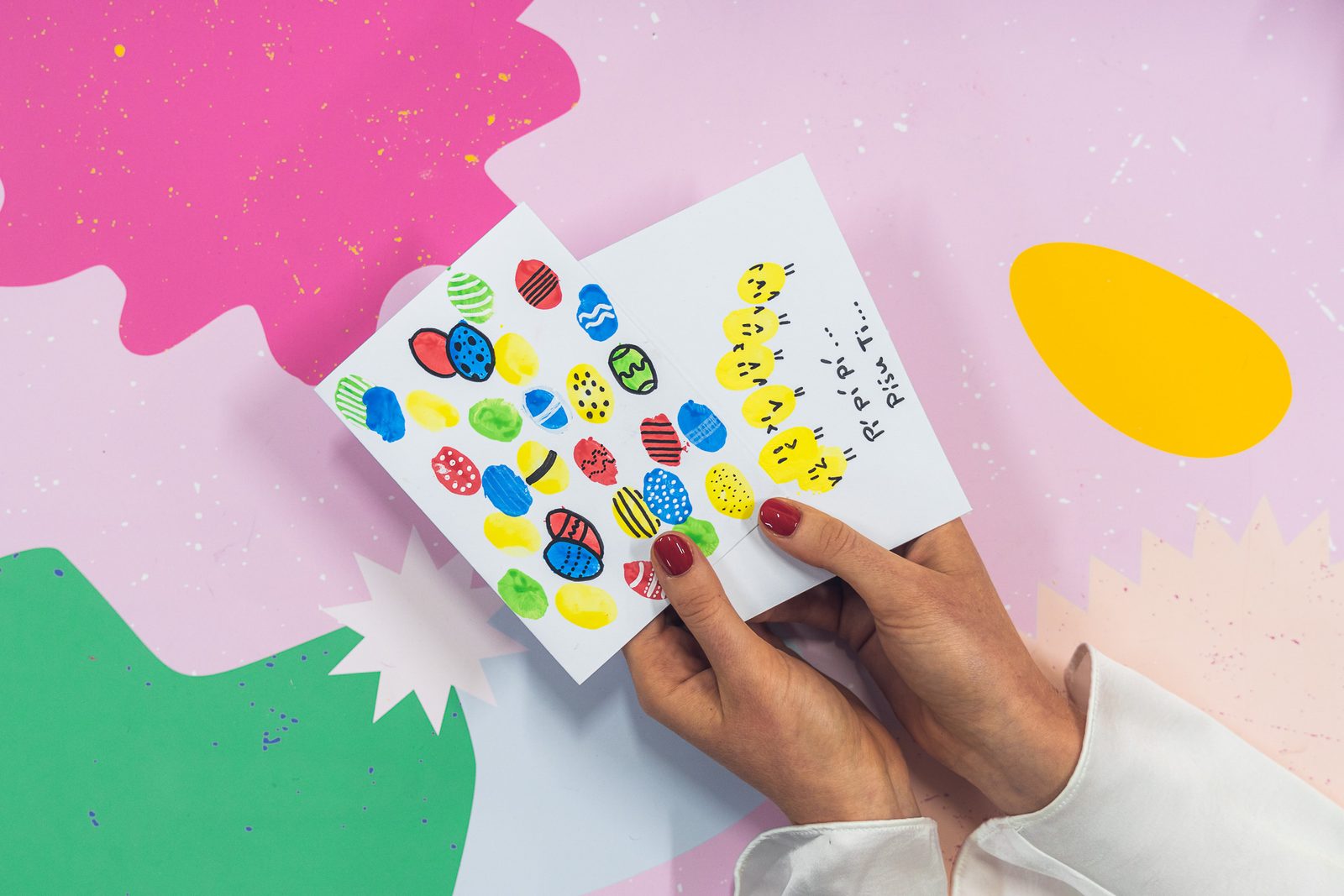 Jakmile je vše na svém místě a dobře zaschlé, může do jednotlivých otisků dokreslit detaily. Ať už to bude vzor vajíček nebo třeba kuřátko.