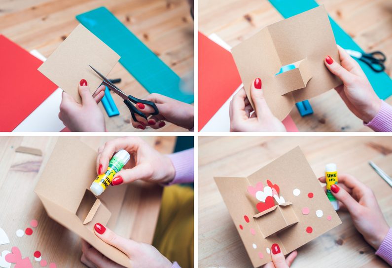 Pomocí řezáku nebo nůžek prostřihneme do zavřeného přáníčka dvě linie, vedoucí od přeloženého okraje do středu přáníčka. Délka řezu je cca 4 cm. Vznikne nám volná část, kterou promáčkenem dovnitř přáníčka, a která tvoří box na srdíčka. Z kraftového papíru můžeme udělat boxu okraje, které přilepíme lepidlem.