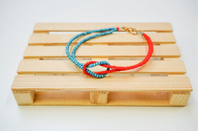 Na dvě červené lanka navlékneme modrý 8/0 rokajl a naopak na modré lanka, zase červený 8/0 rokajl.