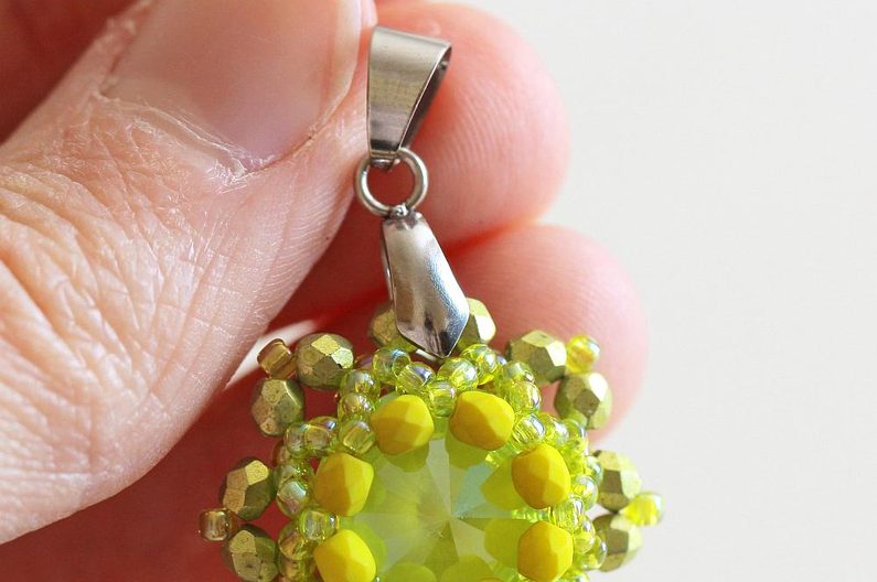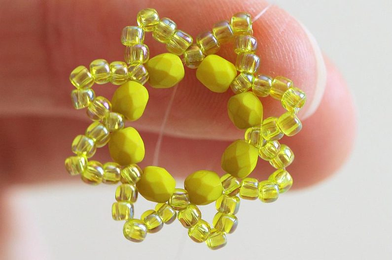 Mezi oba BK3 z předchozího kroku všijeme po celém obvodu 1× TR11. Nyní doporučuji se jehlou protáhnout k druhému konci vlasce, zpevnit uzlíky, zapošít a zastřihnout. Motivek je hotový, pro vytvoření soupravy náušnic a přívěsku budeme potřebovat tři kusy.