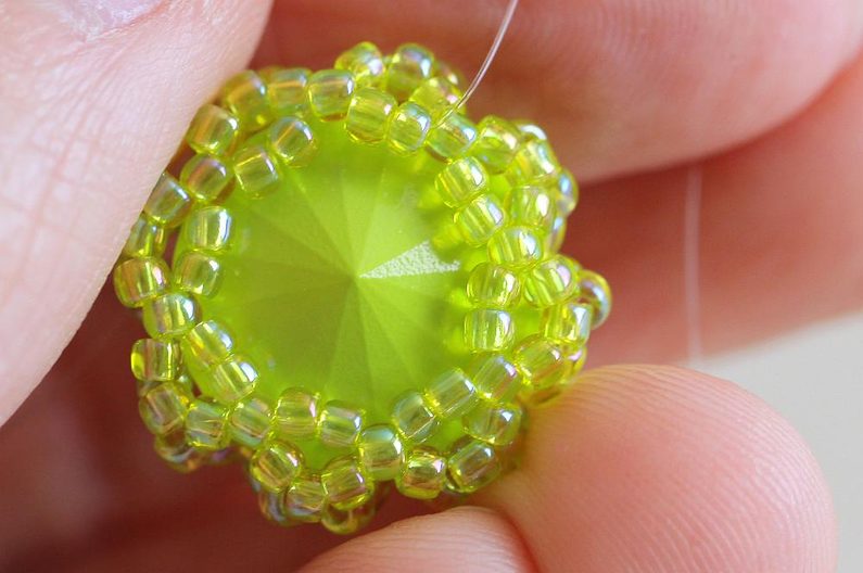 Jehla nám musí vycházet ve špičce paprsku, tedy ve třetím z pěti TR11, které jsme našili v předchozí řadě. Navlékneme 3× TR11 a jehlu provlečeme korálkem ve špičce následujícího paprsku. Opět opakujeme po celém obvodu, což nám po utažení paprsky stáhne a začne se tak tvarovat lůžko.