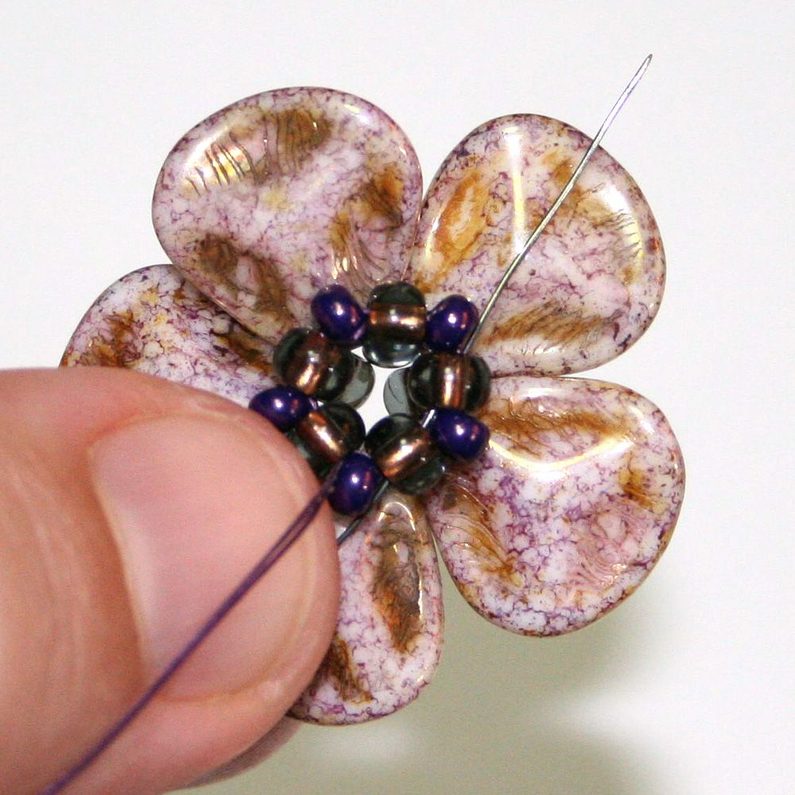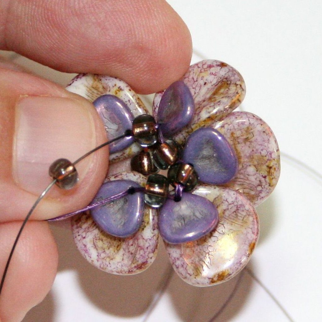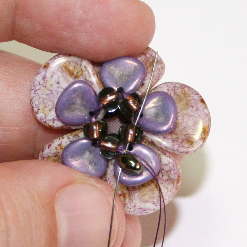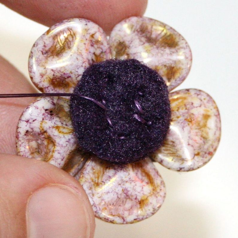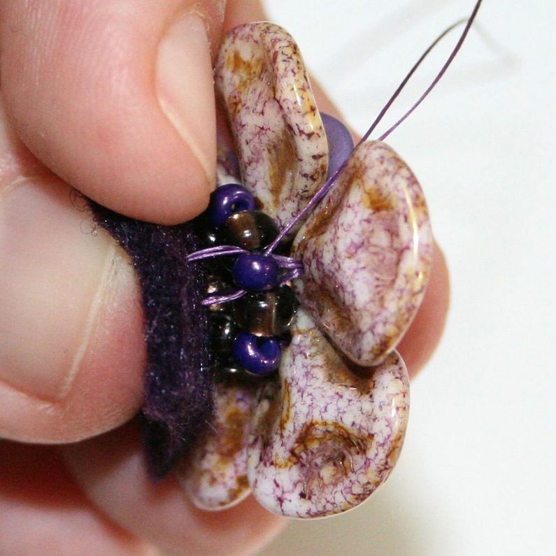 Prošijeme se skrz filc a vyjdeme v centrální části kytičky. Navlékneme korálek Matubo 7/0, vrátíme se zpět do filcu a zauzlíkujeme.