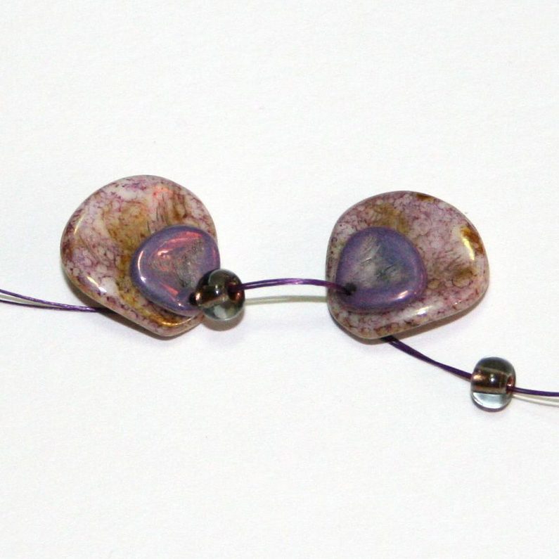 Na dvojitou nit navlékněte korálky v tomto pořadí: lístek B (Rose Petals big) – lístek A (Rose Petals small) – 1C (rokajl 6/0) – lístek A – lístek B – 1C, udělejte dvojitý uzel a prošijte se nahoru. Dávejte pozor, aby lístky byly otočeny obdobným směrem, postupujte podle logiky.