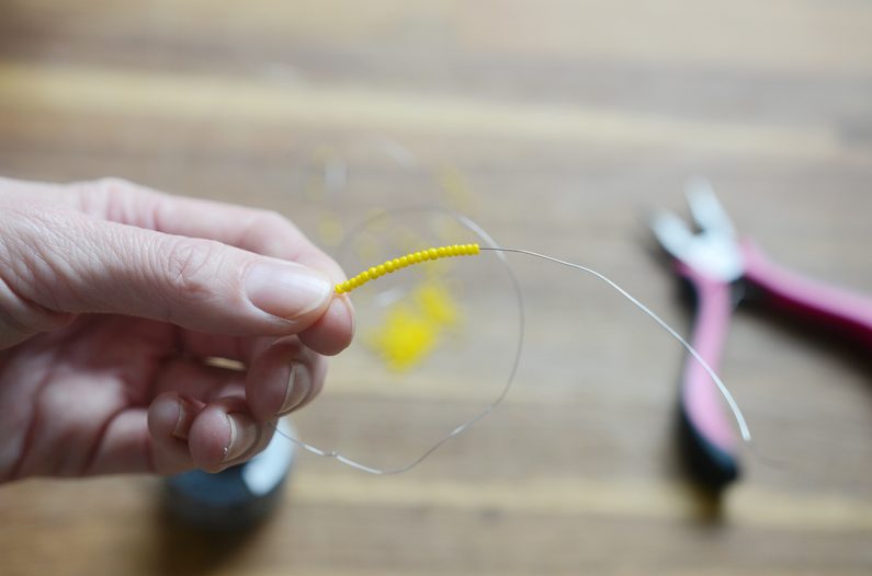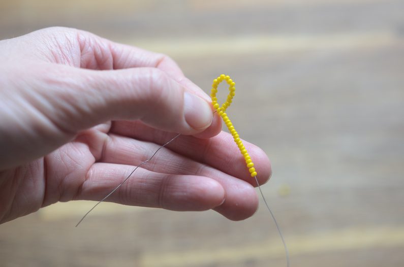 Začněte korálky s menším průměrem. Navlékněte 20 kusů na drátek, poté udělejte smyčku a v protisměru veďte konec drátku skrz první korálek v řadě. Utáhněte a nechte na konci alespoň 5 centimetrů drátu a na druhém alespoň 20 volných centimetrů.