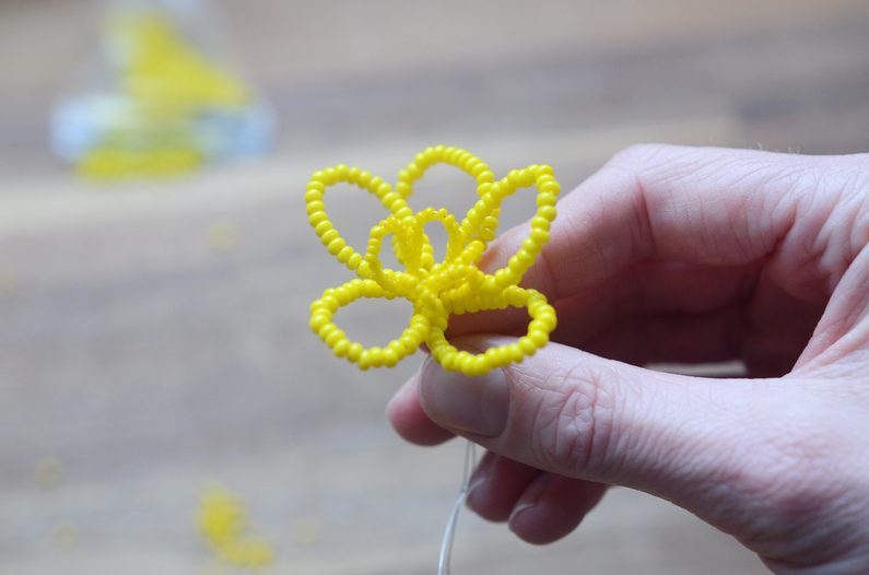 Větší kytičkou obalte menší a všechny volné konce drátků spojte pevně dohromady. Máte hotový první květ.