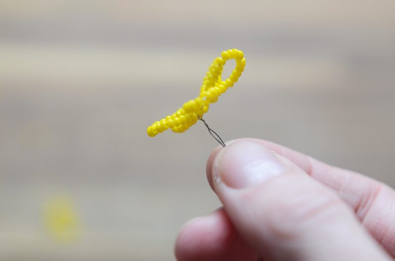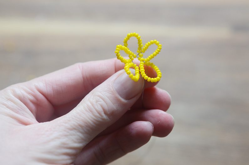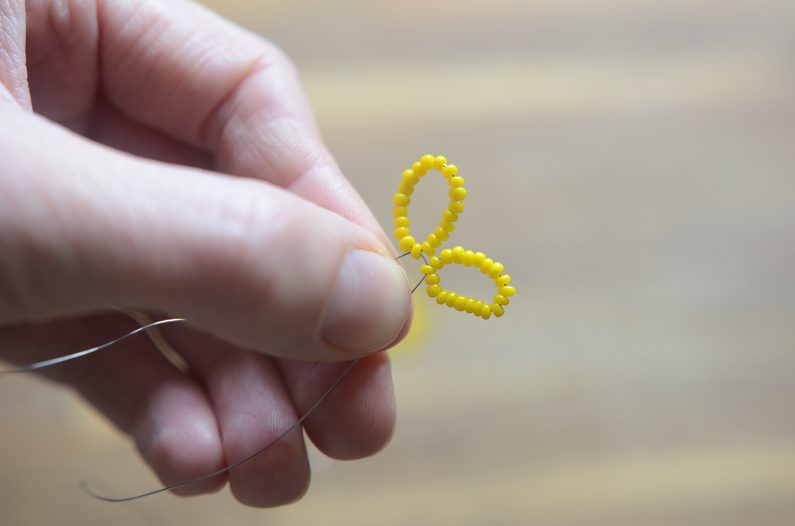 Nyní vezměte korálky s větším průměrem a budete opakovat stejný postup jako s korálky s menším průměrem. Tentokrát ale navlékejte korálky po 30 kusech na každé očko. Opět vytvořte celkem 5 oček.