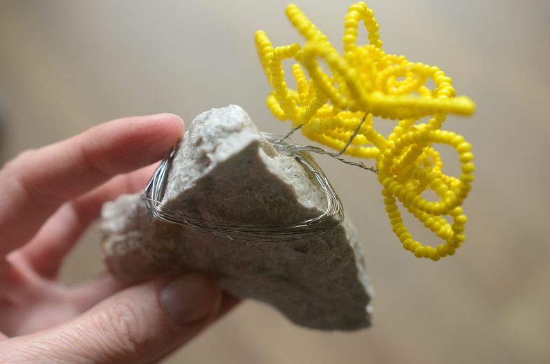 Vytvořte si více kytiček a opět jejich volné konce zamotejte pevně dohromady a následně omotejte kolem vybraného kamínku.
