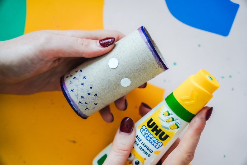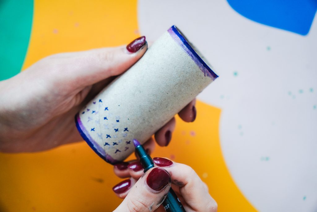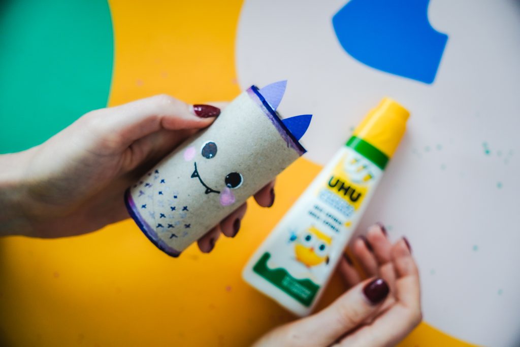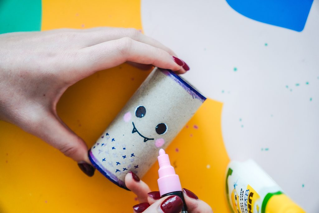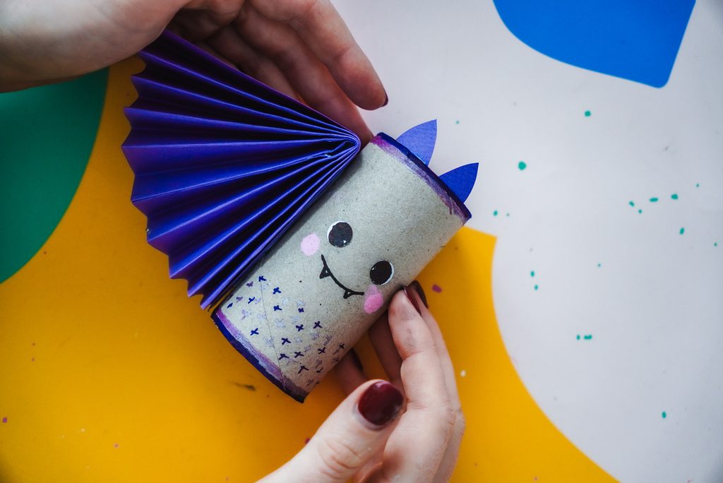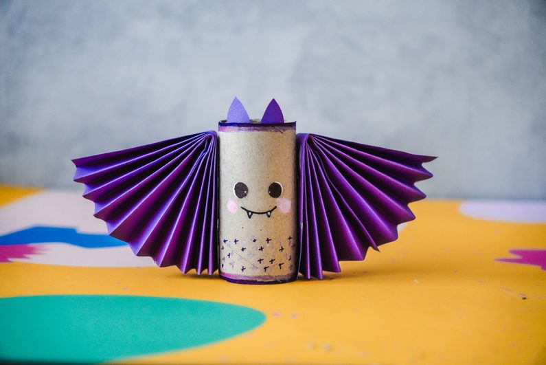 Na ruličko od toaletního papíru namalujeme pomocí fixů obličej a tělo netopýra.