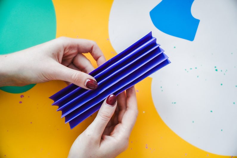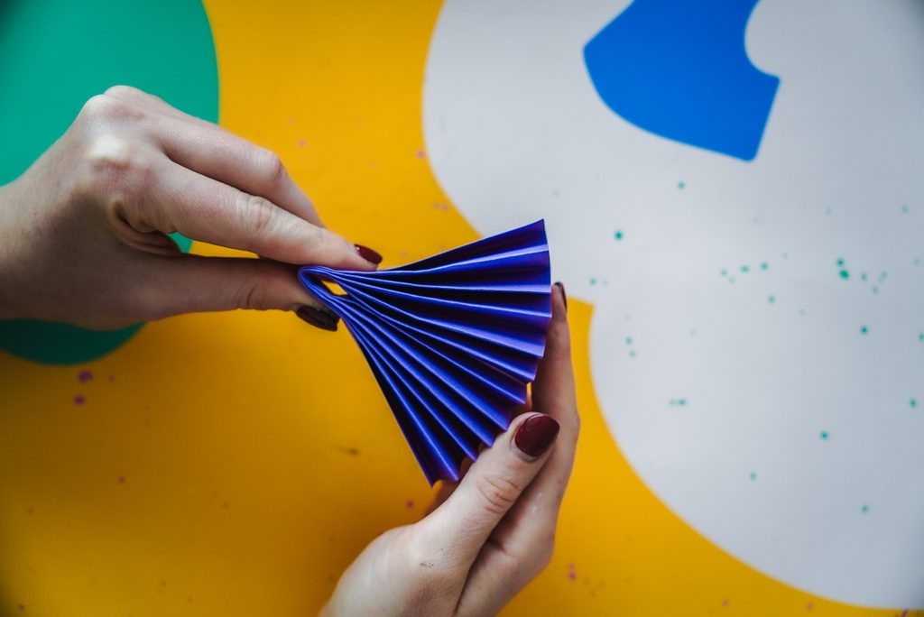 Vezmeme si A4 barevný papír, který rozpůlíme na 2xA5 a každý z nich poskládáme do harmoniky.