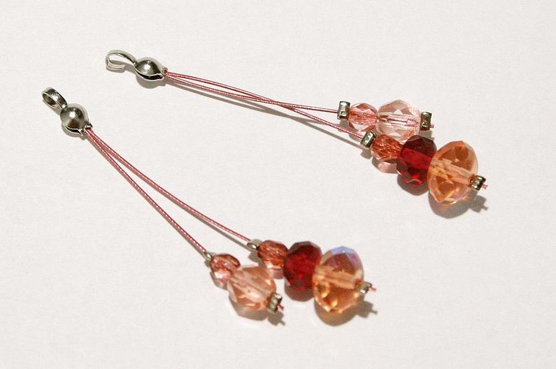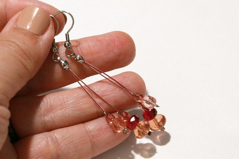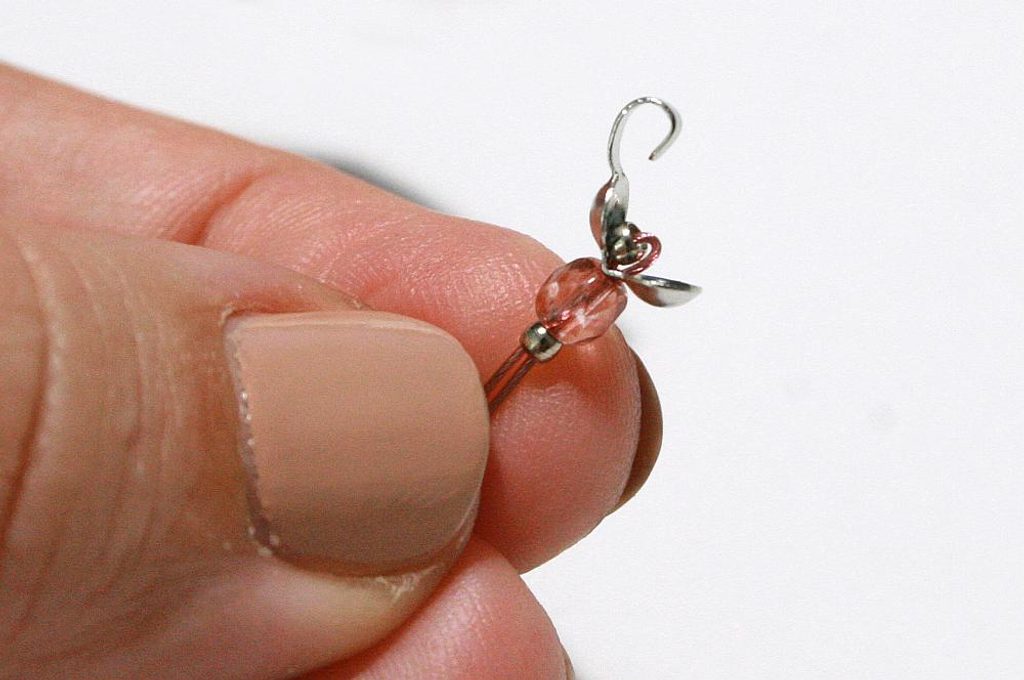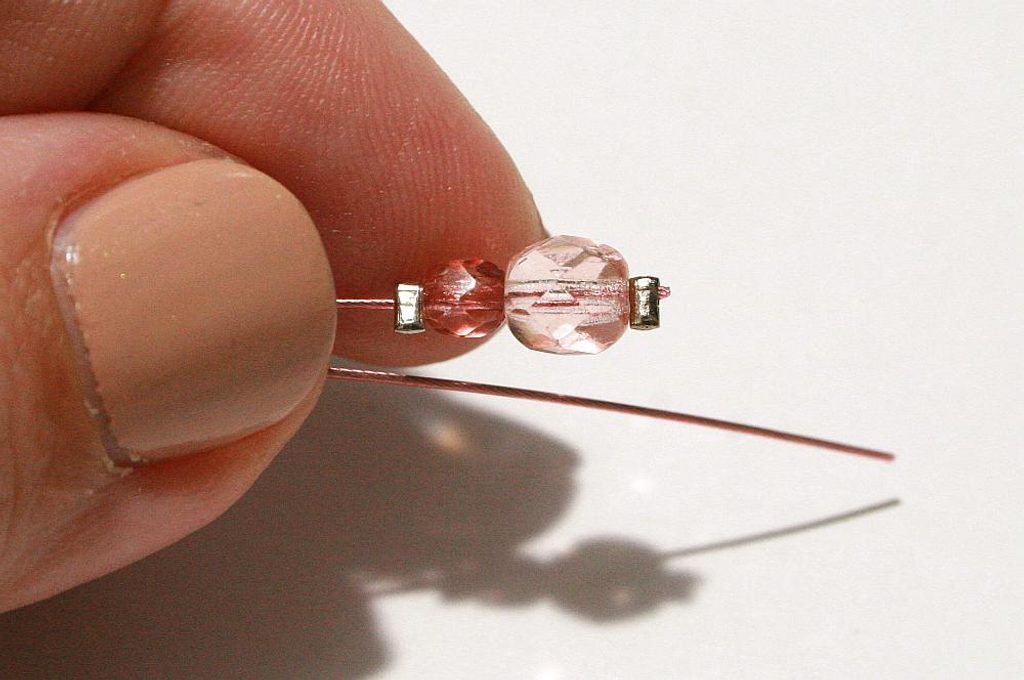 Teď na oba konce lanka přidejte korálky a zachyťte je zamačkávacím rokajlem, udělejte to samé pro druhou náušničku. A pak pripevněte náušnicové háčky a máte hotové náušnice do sady.