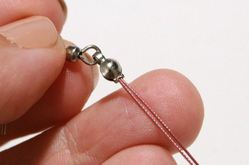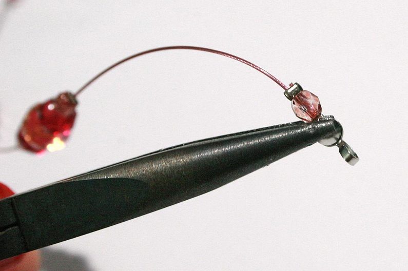 Změříme délku náhrdelníku a fixou označíme délku, která nám stačí na krk. Konce zpracujeme do kaloty: navlékneme zamačkávací rokajl, korálek 4 mm, kalotu, korálek 10/0 a vrátíme se zpět do kaloty přes korálek 4 mm a zamačkávací rokajl, podtáhneme, zamáčkneme rokajl a zbytek lanka uštípneme. Zavřeme kalotu a to samé uděláme s druhým koncem lanka.
