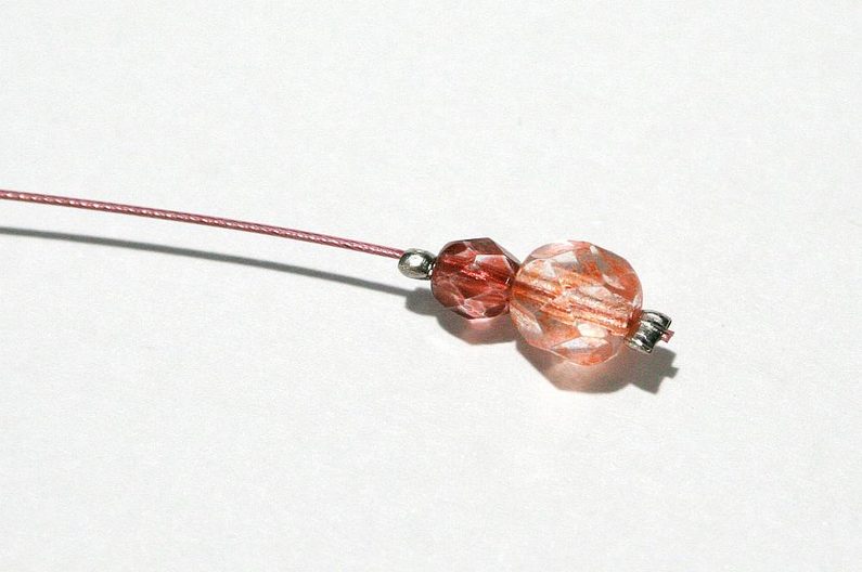 Na tento náhrdelník potřebujeme 2 kousky lanka o délce cca 60 cm. Na každém konci navlékneme dva korálky, které zachytíme zamačkávacími korálky. Pak spojíme ta dvě lanka dalším zamačkávacím korálkem někde v délce 2,5–3 cm.