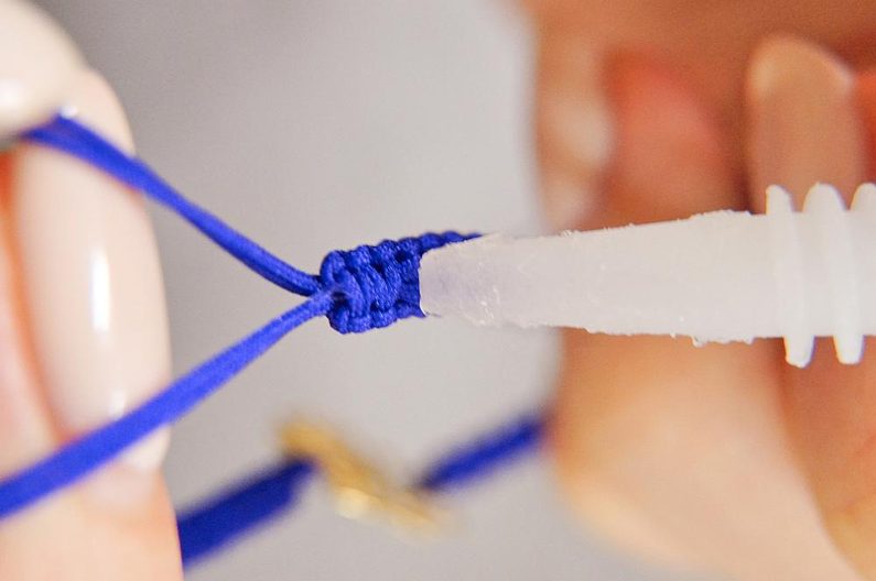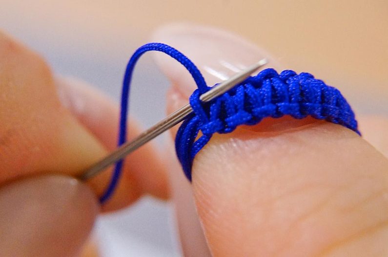 Na jehlu navlékneme jednu ze šňůr, kterou jsme uzlíkovali zapínání a vedeme vzniklým tunýlkem. Ale je třeba si dát pozor, abychom jehlou nepřošili i základní šňůry shambala náramku, jinak by vzniklé zapínání nebylo posuvné. (Obr. 9-10)