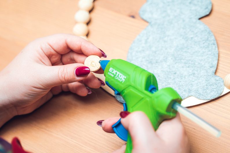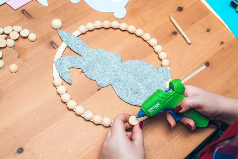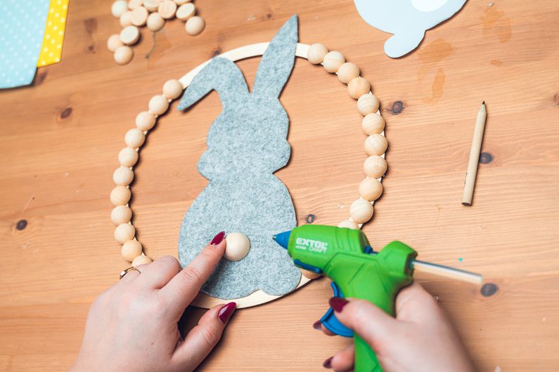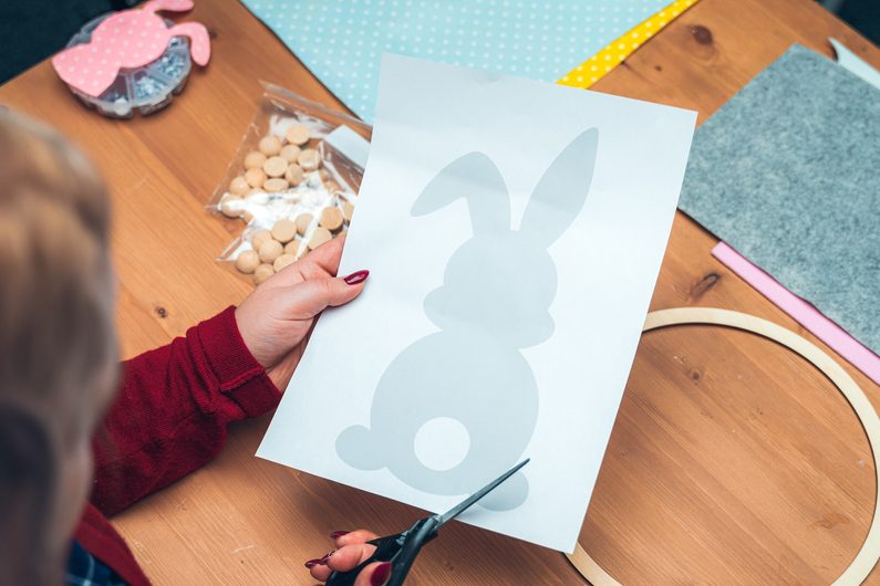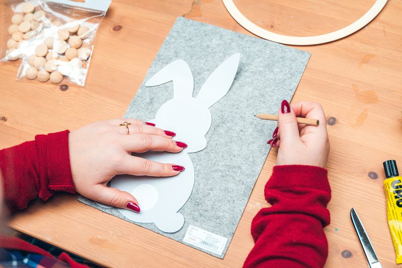 Vystříhneme si z papíru obrys zajíčka (nahoře můžete kliknout na "Stáhnout návod" a stáhne se vám šablona na vystřižení) a překreslíme si ho na filc. Poté tvar vystřihneme a pomocí tavné pistole nalepíme na dřevěný kruh. Dejte si pozor, abyste filc dobře napnuli.