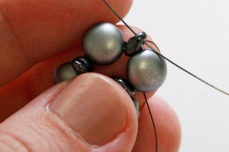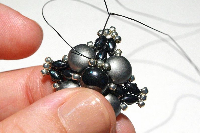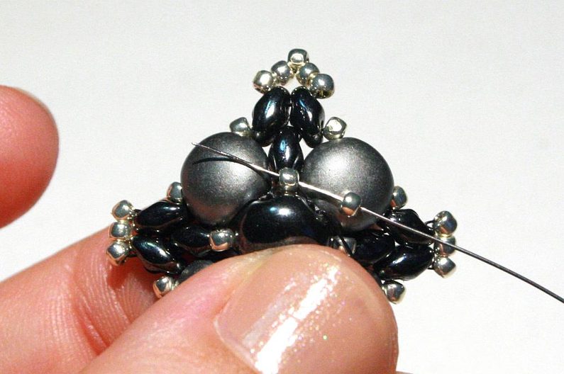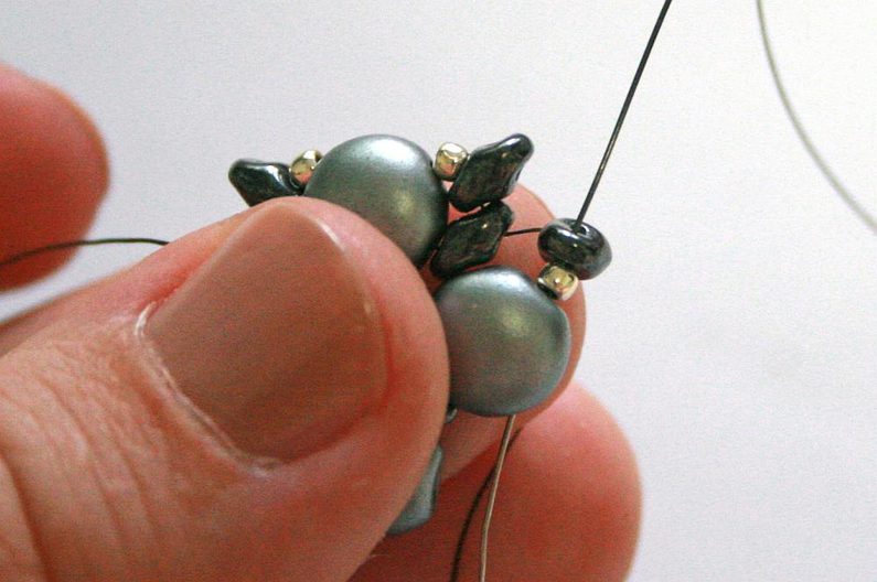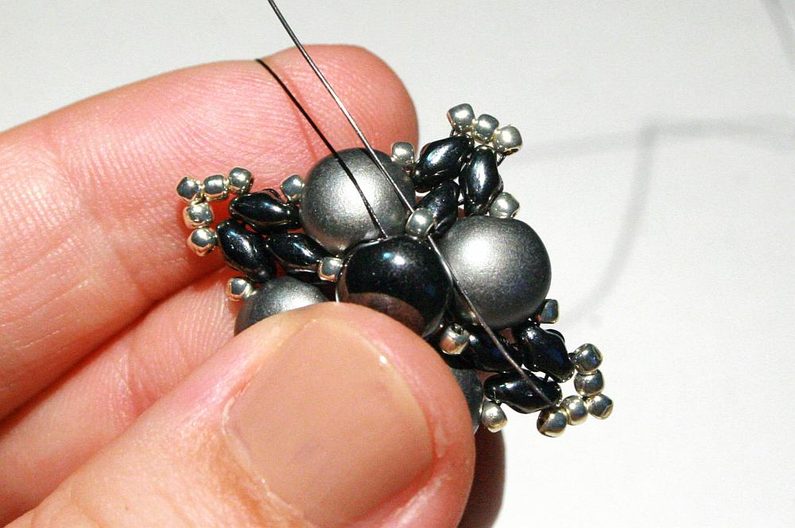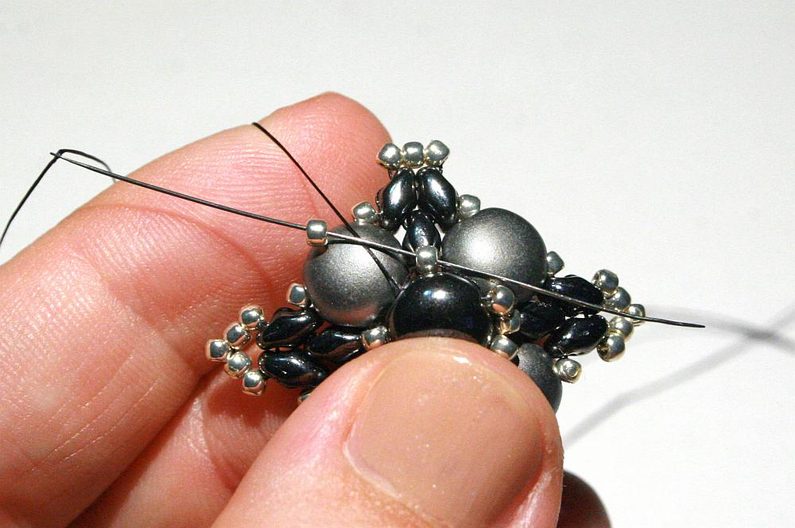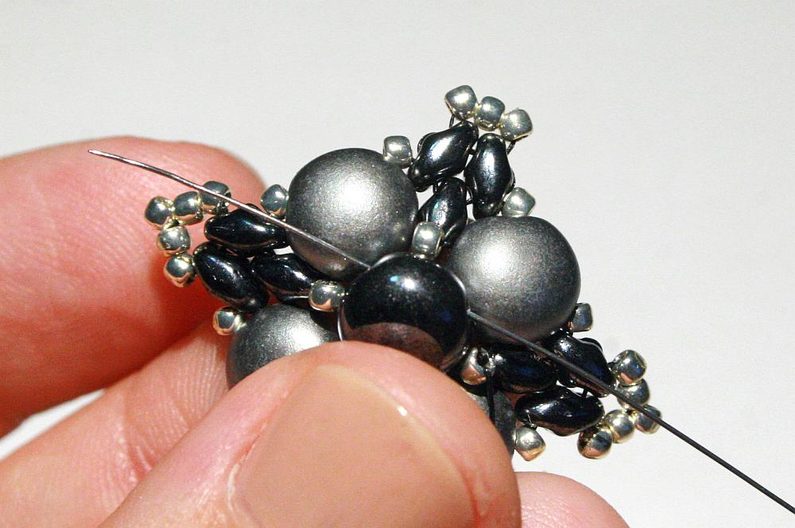 Teď k těmto korálkům, co jsme přidávali v předchozím kroku, přišijeme hematitový Candy: projdeme skrz korálek Toho, dále přes jednu dírku Candy, přes korálek Toho na protistraně a přes druhou dírku Candy (obr. 19–20). Nyní přišijeme tento Candy do Toho korálků, které jsou z boku (obr. 21–23).