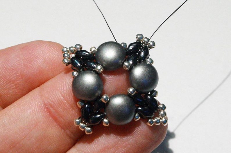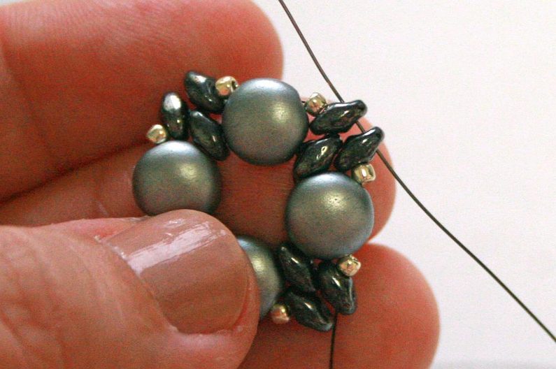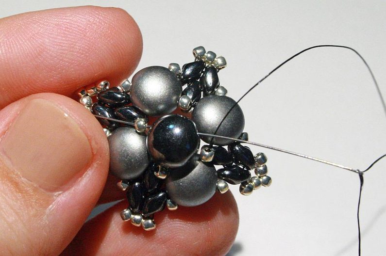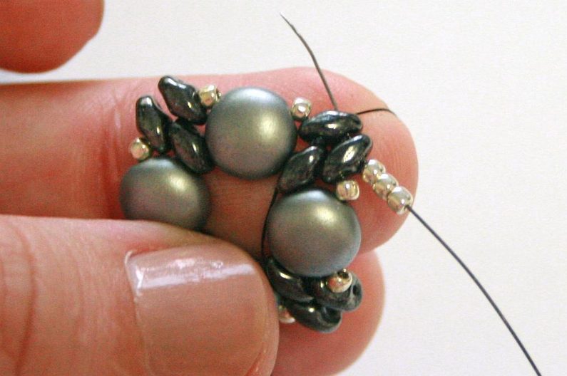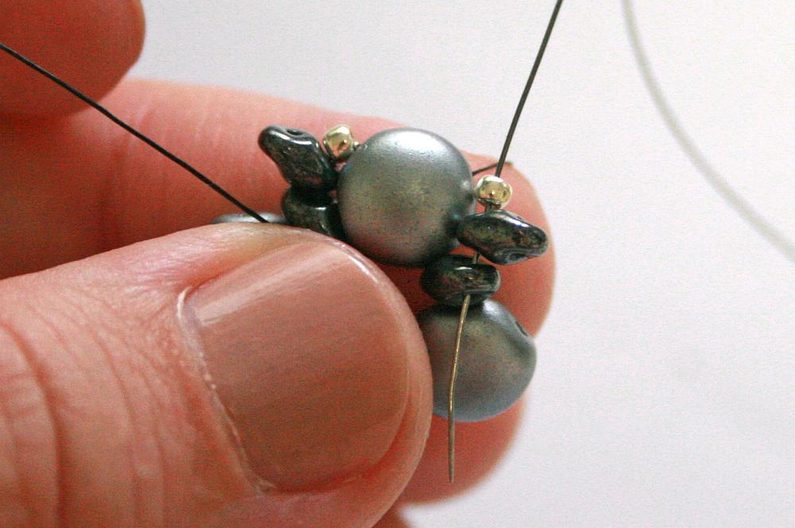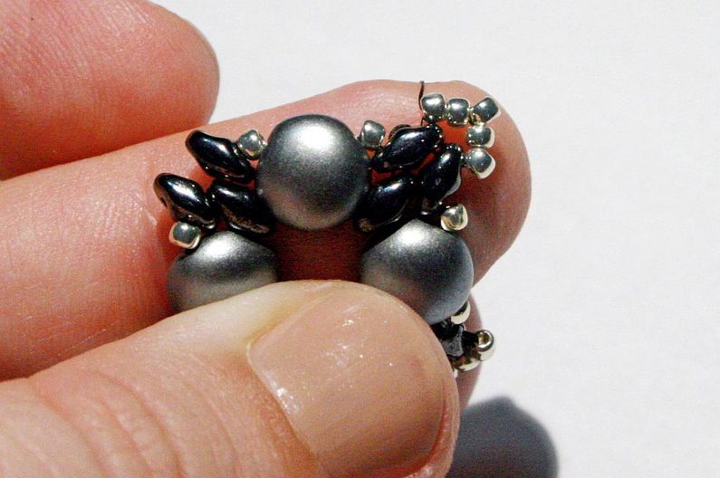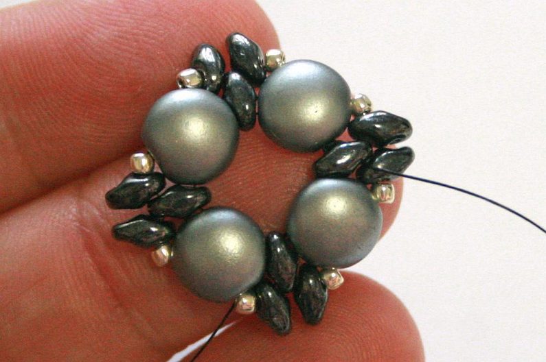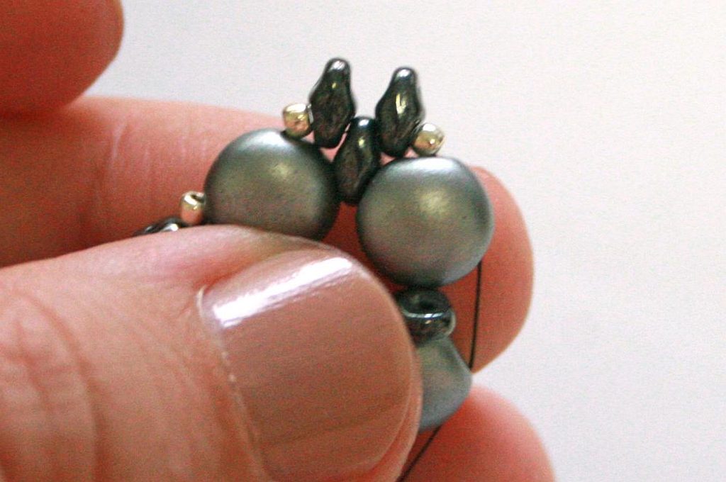 Teď k těmto korálkům, co jsme přidávali v předchozím kroku, přišijeme hematitový Candy: projdeme skrz korálek Toho, dále přes jednu dírku Candy, přes korálek Toho na protistraně a přes druhou dírku Candy (obr. 19–20). Nyní přišijeme tento Candy do Toho korálků, které jsou z boku (obr. 21–23).