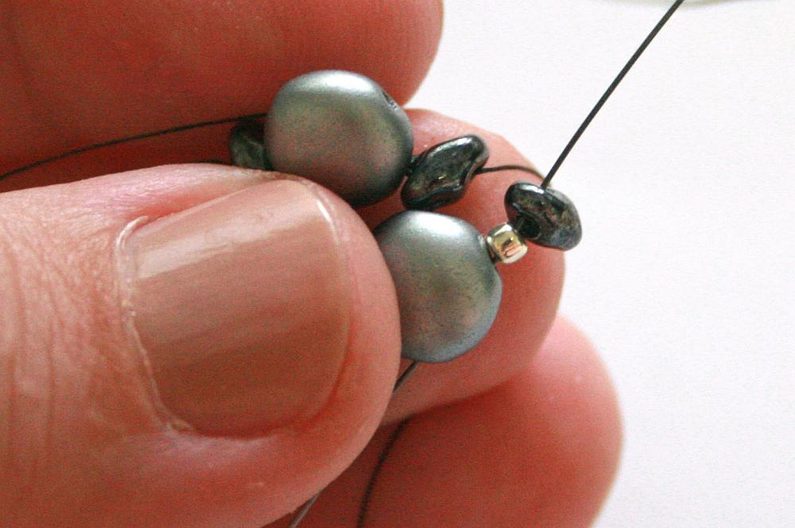 Ustřihněte si zhruba 1 m niti One-G. Navlékněte střídavě 4 SuperDuo a 4 Candy, posuňte na konec niti a zauzlujte. Prošijte se přes korálky tak, abyste vyšli v horní dírce jednoho SuperDua. Dále navlékněte SuperDuo a jeden korálek Toho, pak projděte skrz horní dírku Candy.