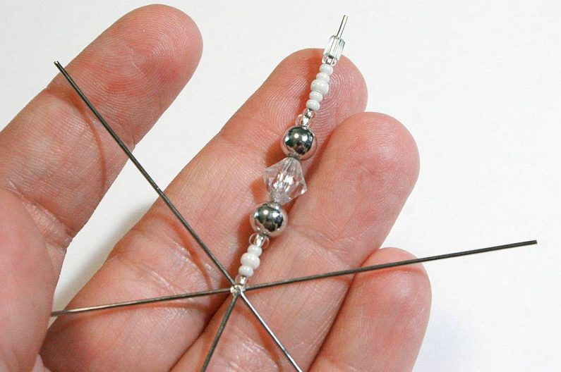 Navlékněte korálky na jednotlivé drátky v takovémto pořadí: PR10a – PR10b – PR8b – PR10b – PR8a – AP6 – AB8 – AP6 – PR8a – PR10a – 2xPR10b – PR8b – 2x PR10b – PR10a