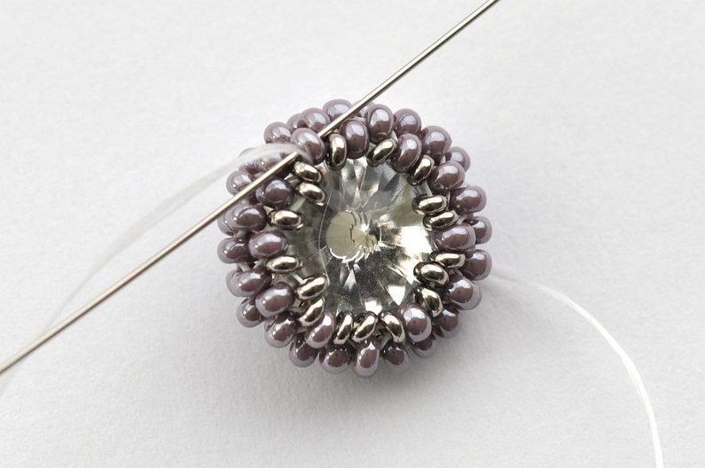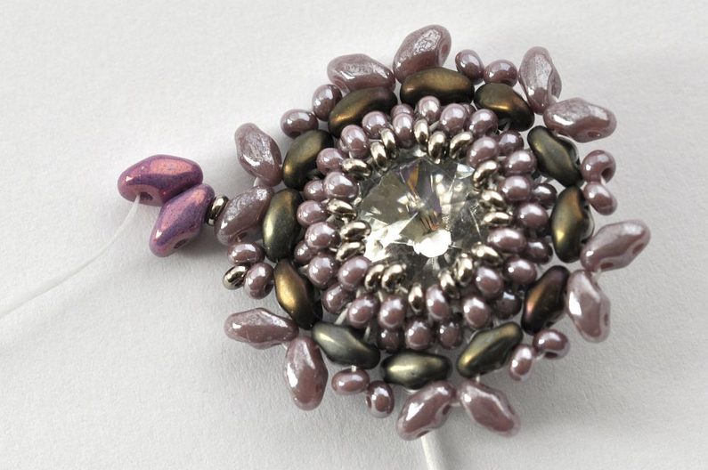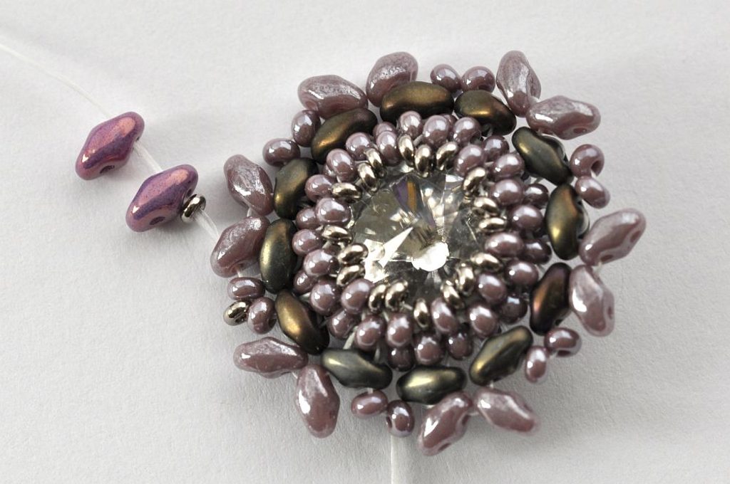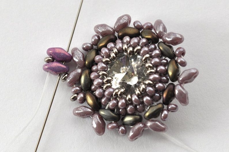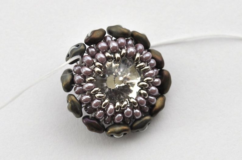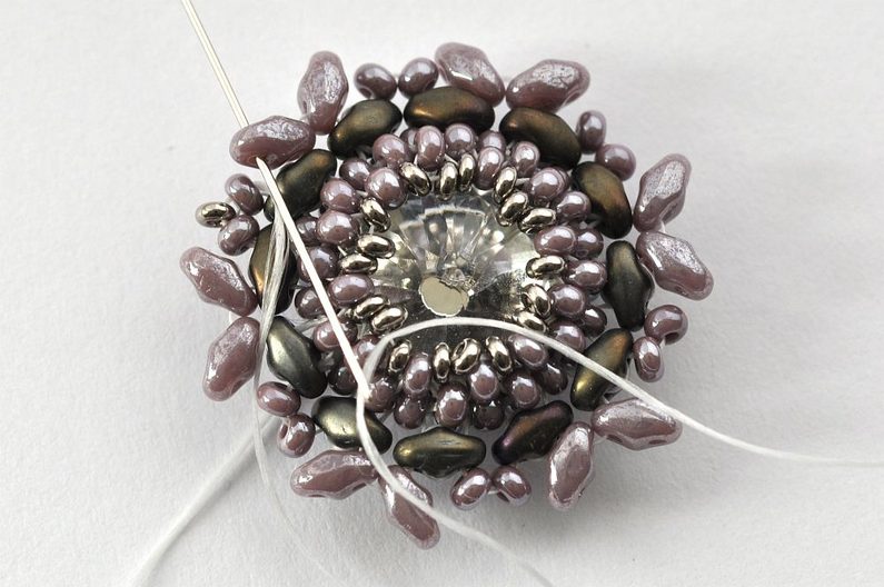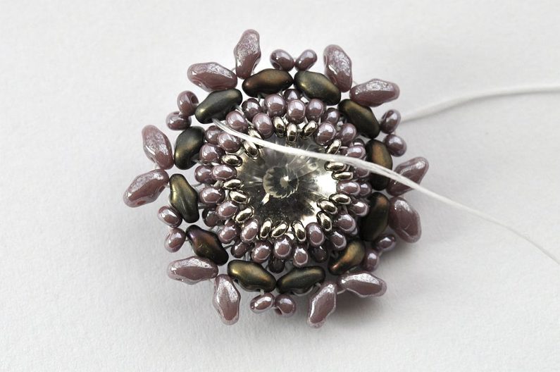 Obšití rivolky zakončíme poslední, 11. řadou. V této řadě vždy jeden rokajl TOHO Demi Round přidejte a druhý vynechte. V místech, kde budete vynechávat nit, protáhněte skrz rokajl Preciosa v deváté řadě (obr. 11). Nezapomeňte hodně utahovat, aby rivolka v kalíšku pevně držela (obr. 12).