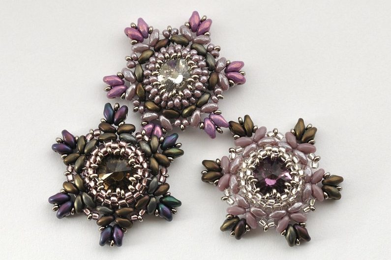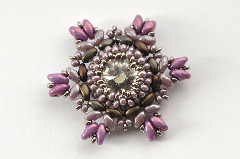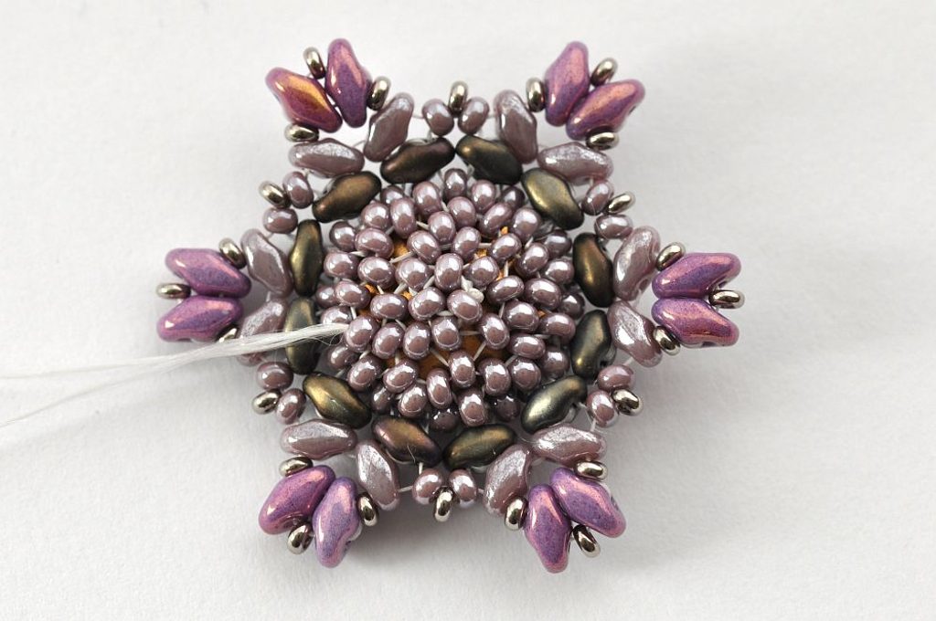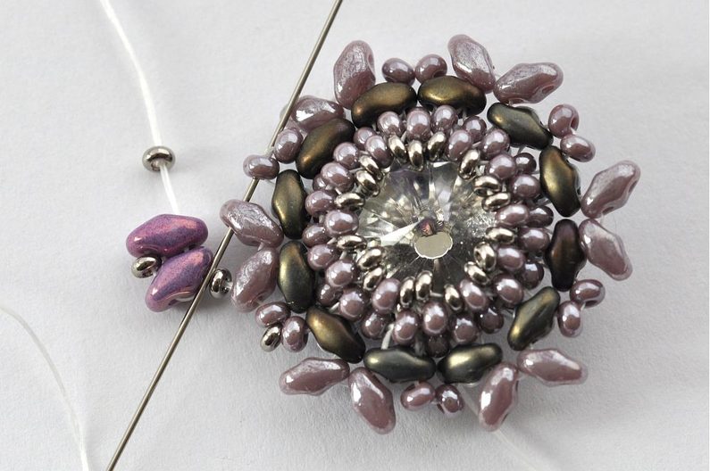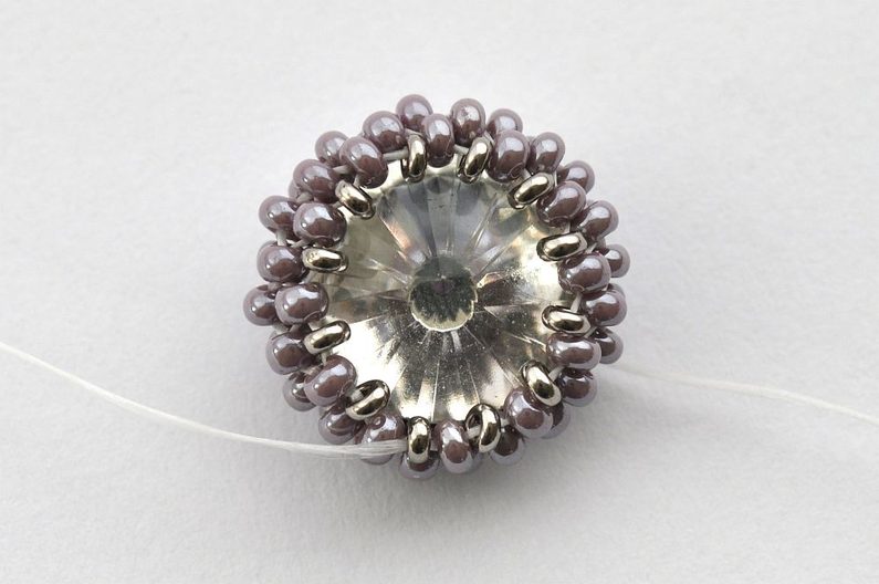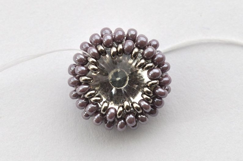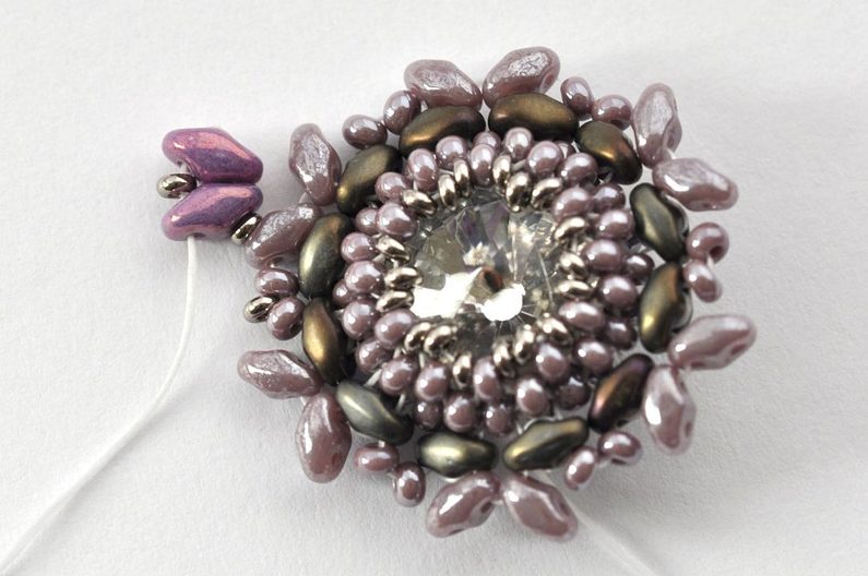 Obšití rivolky zakončíme poslední, 11. řadou. V této řadě vždy jeden rokajl TOHO Demi Round přidejte a druhý vynechte. V místech, kde budete vynechávat nit, protáhněte skrz rokajl Preciosa v deváté řadě (obr. 11). Nezapomeňte hodně utahovat, aby rivolka v kalíšku pevně držela (obr. 12).