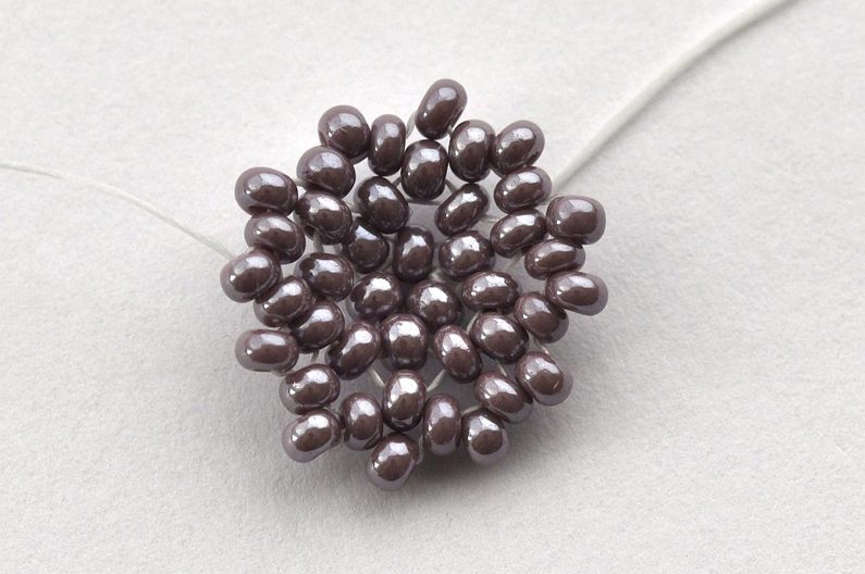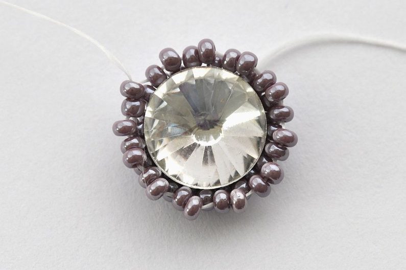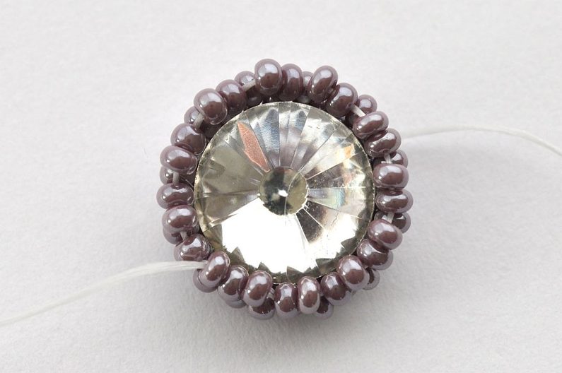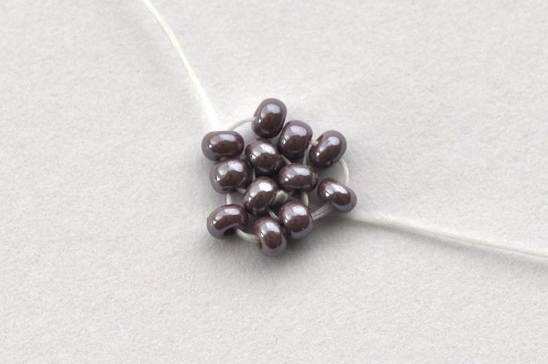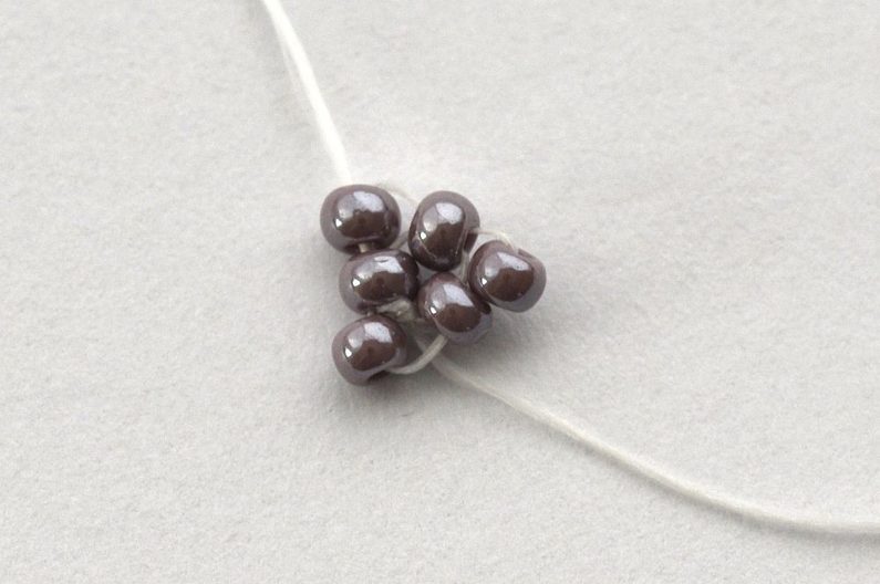 Nejprve obšijeme rivolku. Začneme navlečením tří rokajlů Preciosa velikost 10 na nit. Konec nitě necháme dostatečně dlouhý pro pozdější zavázání a zapošití. Navlečené korálky prošijeme ještě jednou a nit utáhneme. Vznikne tak trojúhelník, který můžeme zajistit svázáním konců nití.